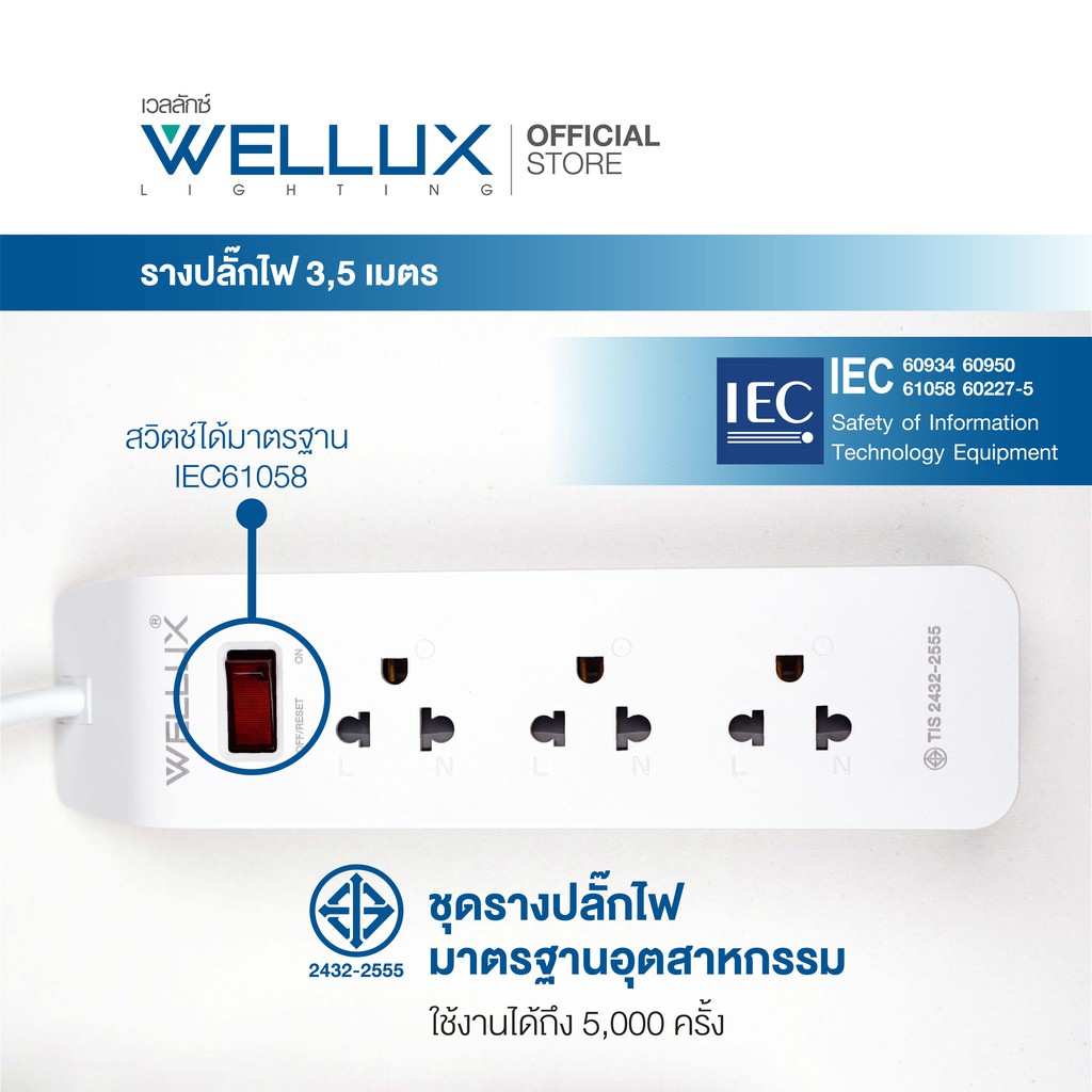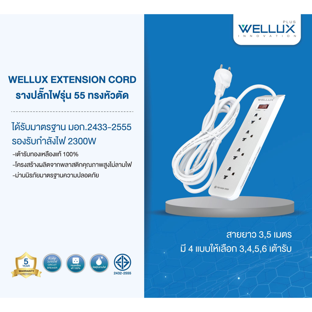 [รุ่น55]WELLUX ปลั๊กไฟคุณภาพ 3,4,5,6 ช่อง ความยาวสายไฟ 3M 5M รองรับกำลังไฟ 2300W เต้ารับทองเหลือง วัสดุไม่ลามไฟ มอก.2433