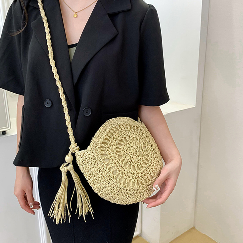 Yogodlns กระเป๋าสะพายไหล่แฮนด์เมดฟางทรงกลมสําหรับผู้หญิงพู่กลวงกระเป๋าสะพายข้างชายหาดฤดูร้อน