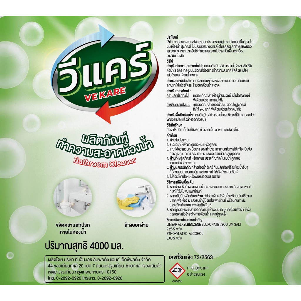 วีแคร์ (VEKARE) น้ำยาล้างห้องน้ำและสุขภัณฑ์ Bathroom Cleaner (4000ml.) สูตรไม่มีกรดHCL