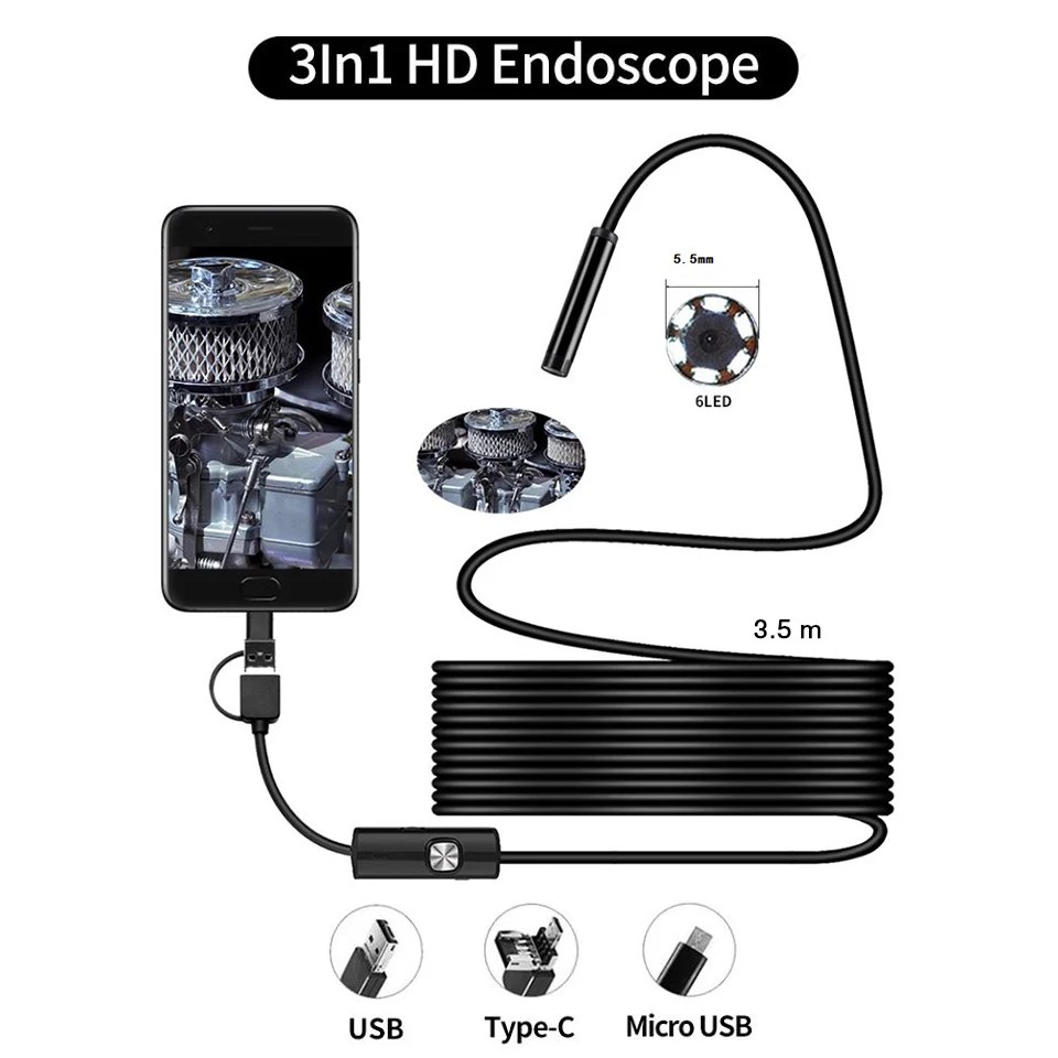 กล้องแอนโดสโคป 3.5 ม. กล้องงูกันน้ำ ต่อคอม มือถือ กล้องส่องท่อ 3 in 1 USB / TYPE-C / Micro-USB Endoscope Camera