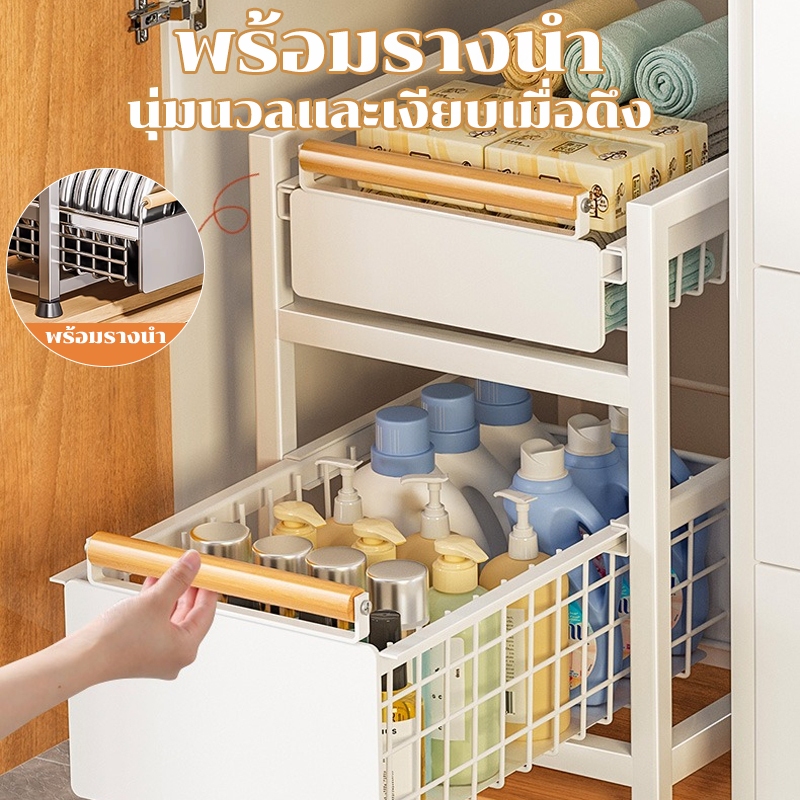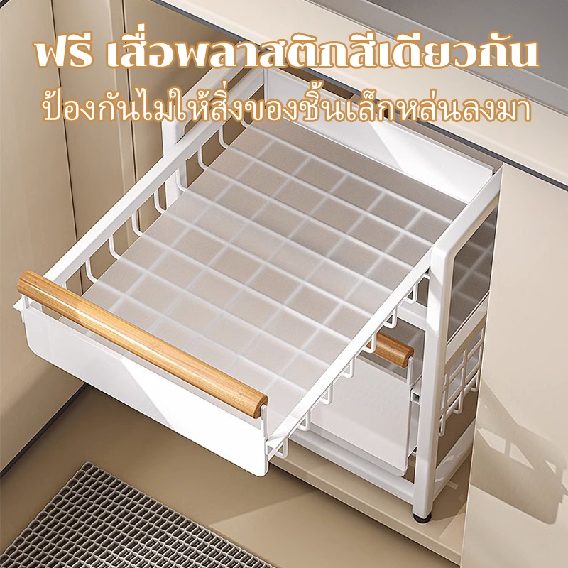 GSlife ชั้นวางของใต้อ่างล้างจาน ที่จับไม้ ไม่จำเป็นต้องติดตั้ง นวางของในครัว ชั้นวางของแบบดึงผลักบนตู้และใต้ตู้