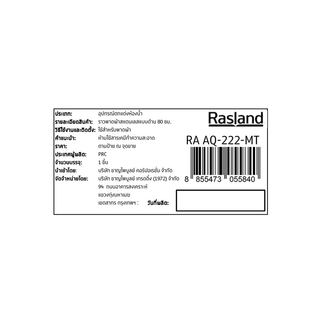 RASLAND ราวพาดผ้าสแตนเลสแบบด้าน 80 ซม. RA AQ-222-MT