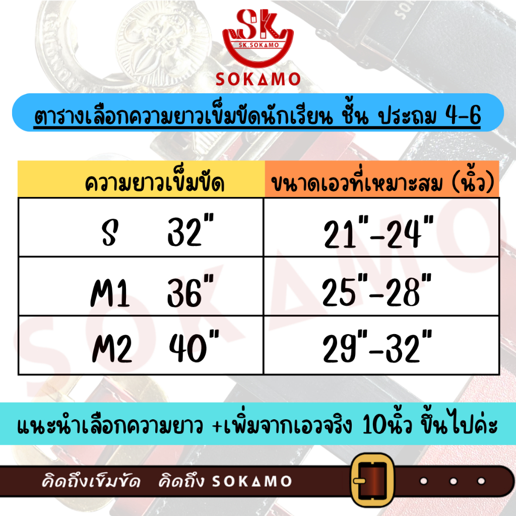 เข็มขัดนักเรียน หนังแท้ 100% สีน้ำตาล หัวสีทอง (สำหรับชั้นประถม 4-6) SOKAMO