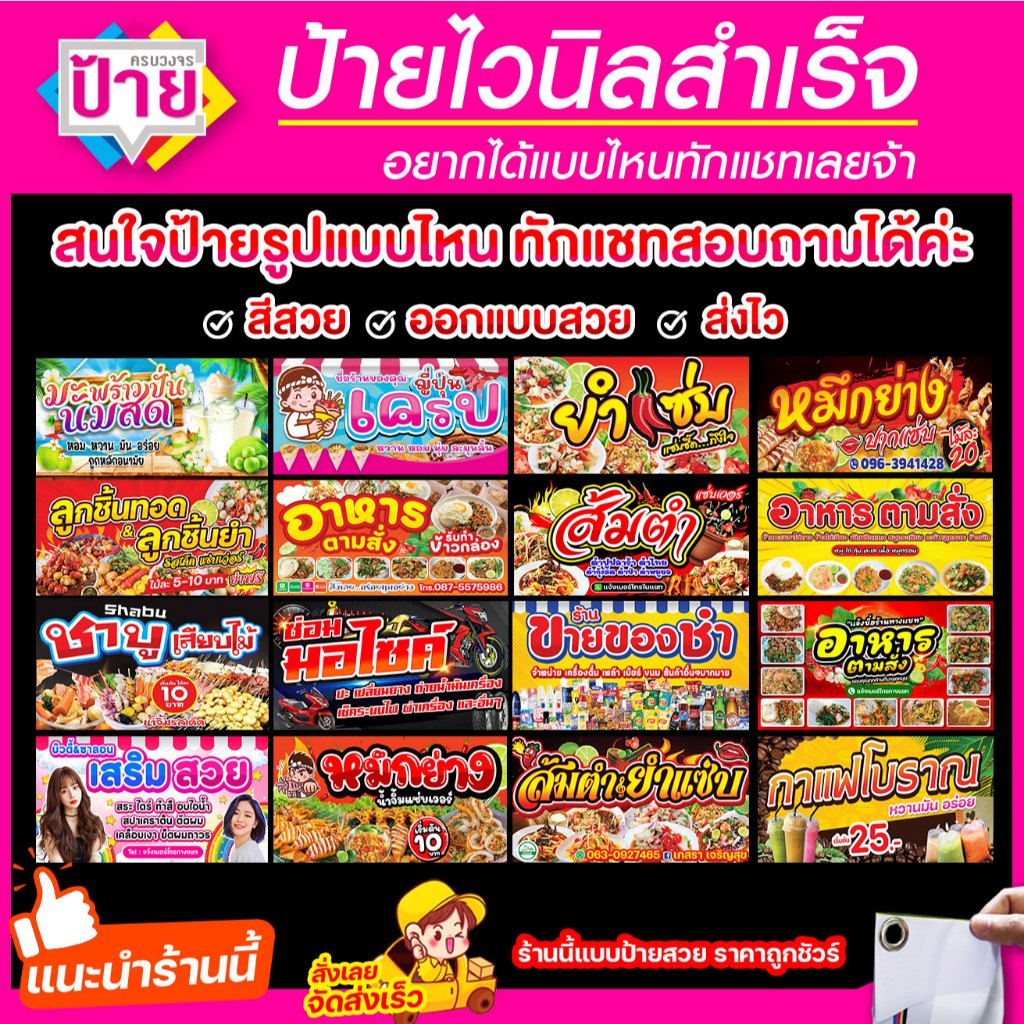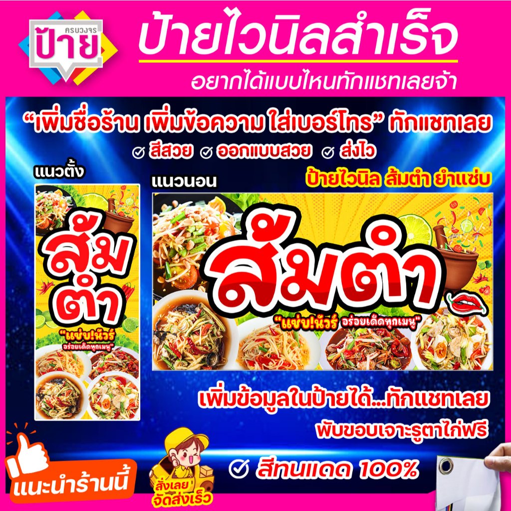 ป้ายไวนิลส้มตำ แก้ไขข้อมูลได้แจ้งทางแชท พับขอบเจาะรูพร้อมใช้งาน มีหลายแบบหลายขนาด จัดส่งไว