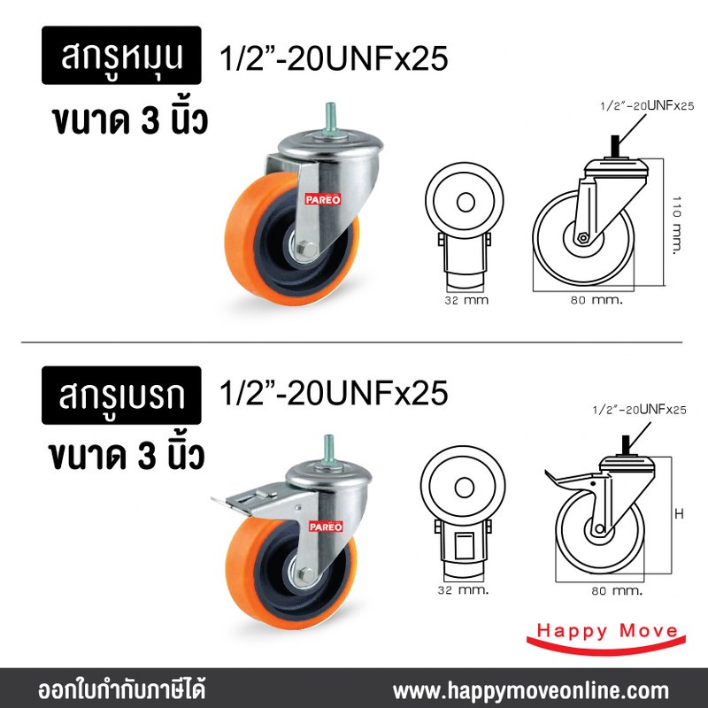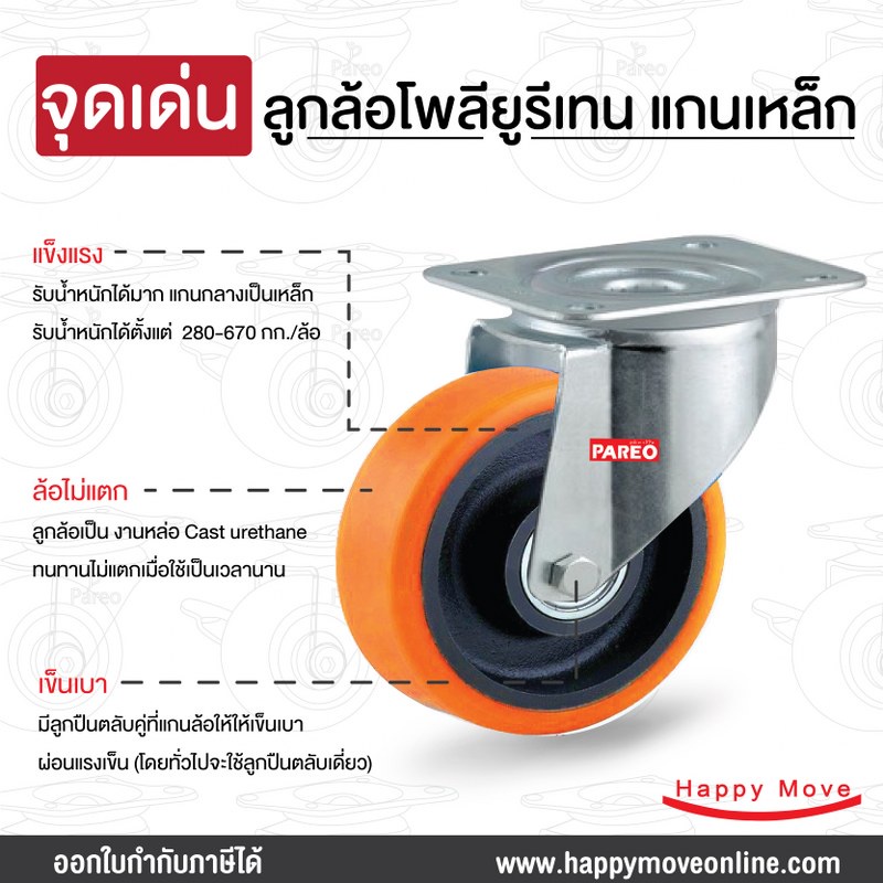 ล้อรถเข็นของ 3 นิ้ว (80มม.) ล้อโพลียูรีเทน ล้อไม่ทำพื้นเป็นรอย ล้อไม่แตก รับได้100-150กก.รุ่น Value