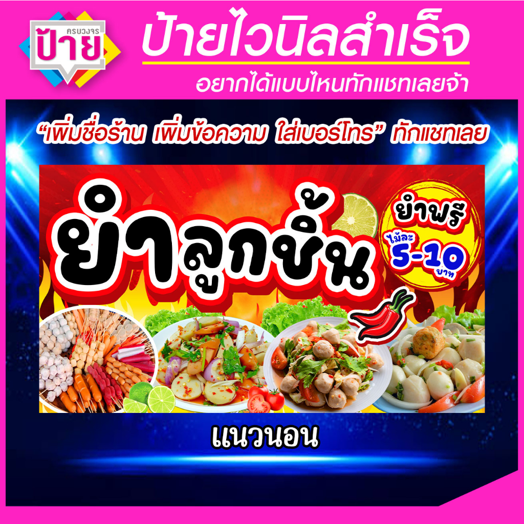 ป้ายไวนิลยำลูกชิ้น พับขอบเจาะรูฟรี (ผ้าไวนิลเกรด A หนามากขาดยาก)