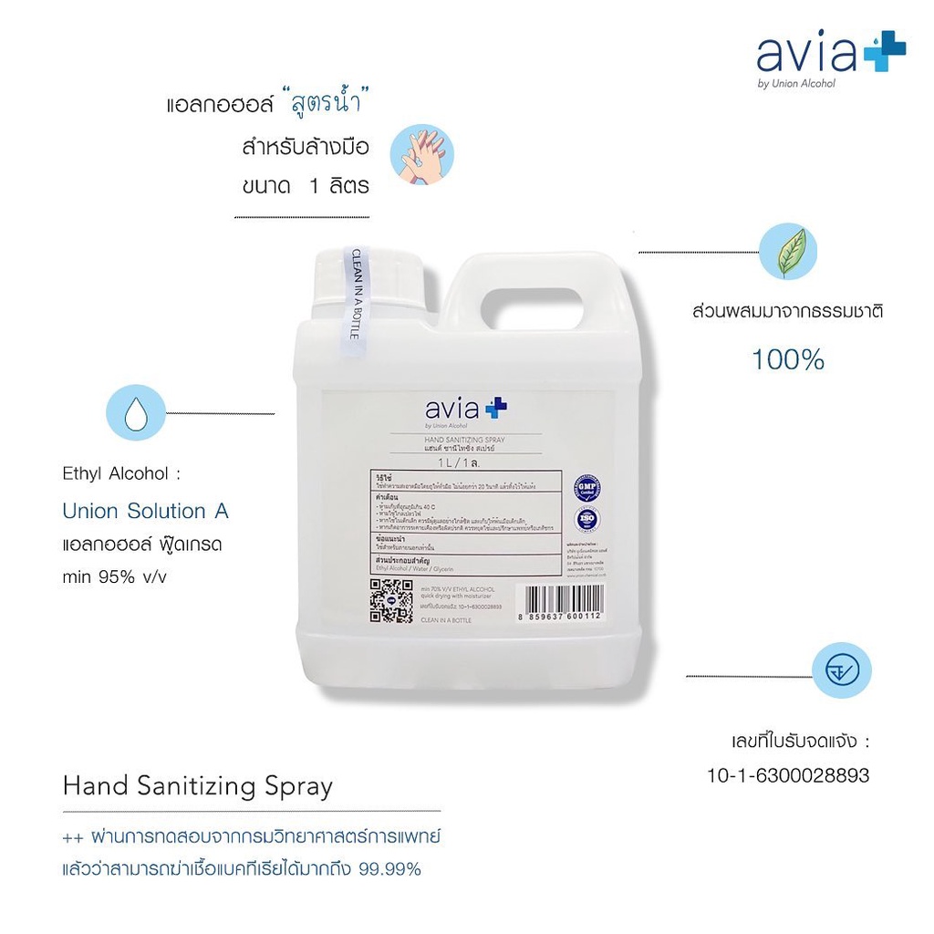 avia by Union Alcohol สเปรย์แอลกอฮอล์ล้างมือ 1Lt. / 1ลิตร. / Food Grade Sanitizer. (ฟู้ดเกรด)