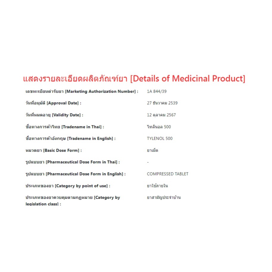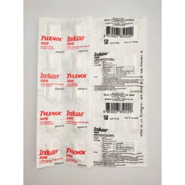 Tylenol 500 mg ไทลินอล 500 พาราเซตามอล 10 เม็ด ยาสามัญประจำบ้าน จำนวน 1 แผง 00830