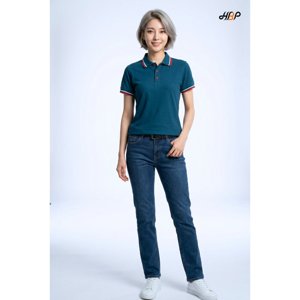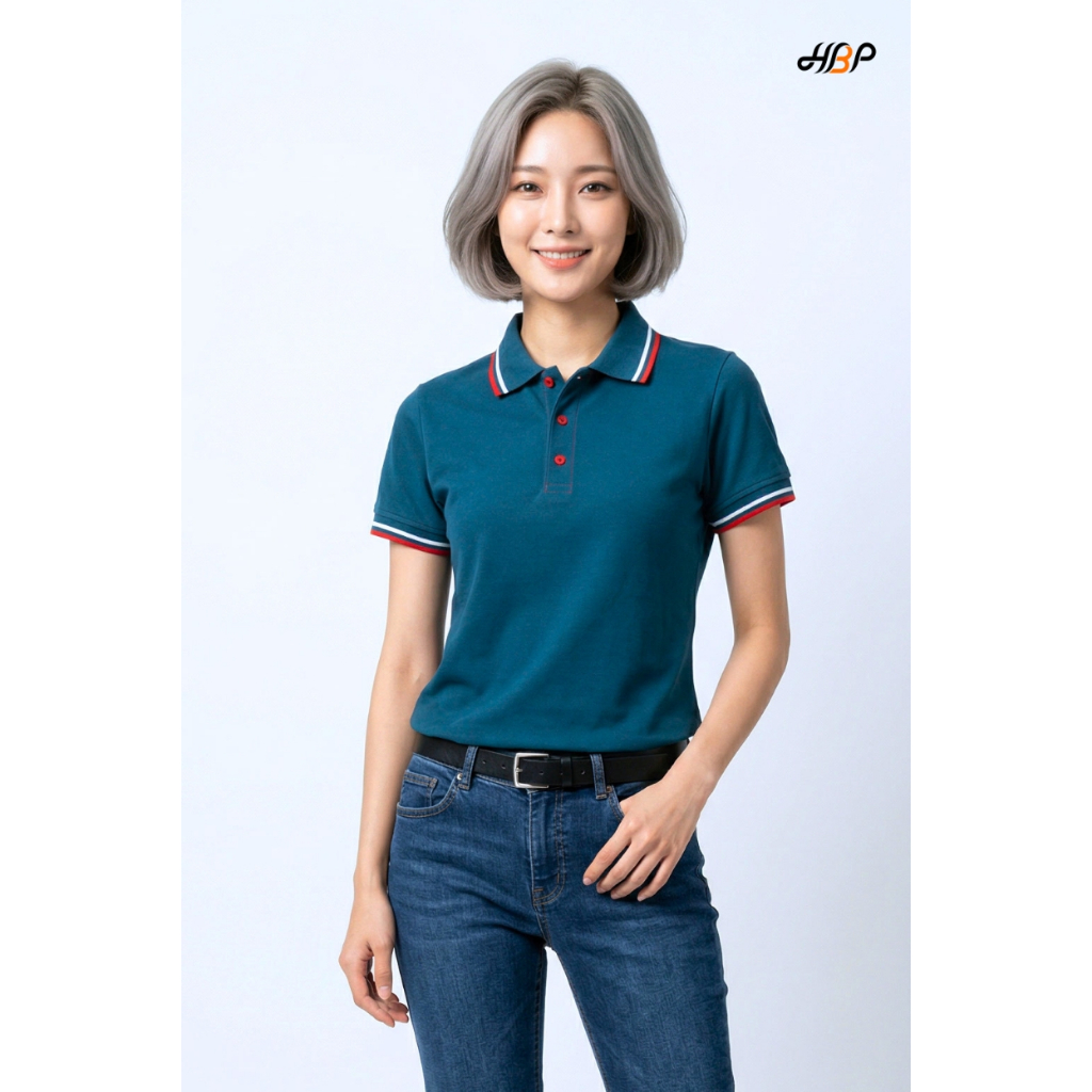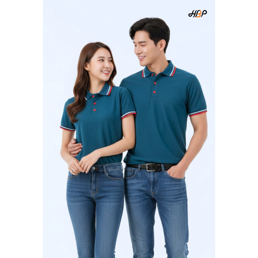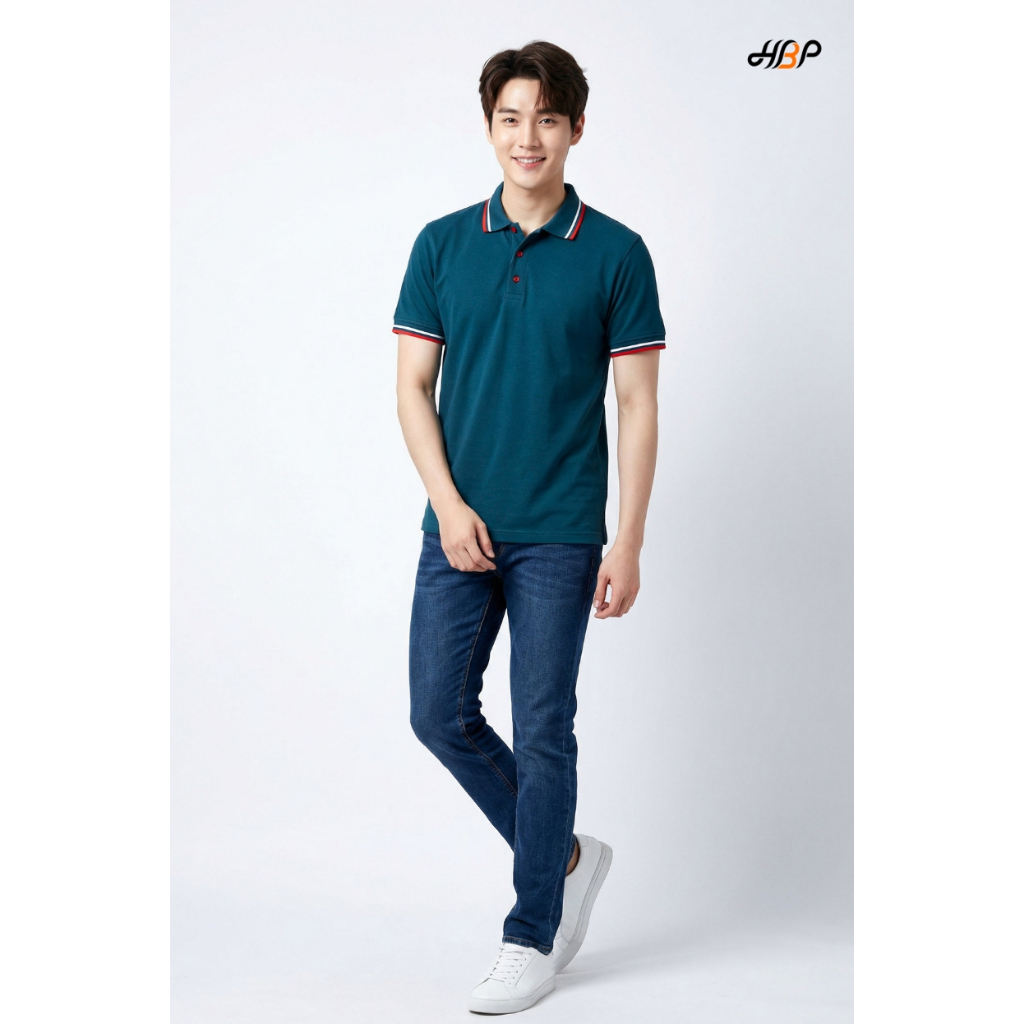 เสื้อโปโลสีเขียวหยกเข้มขลิบแดง แขนจั้ม เนื้อผ้า TK