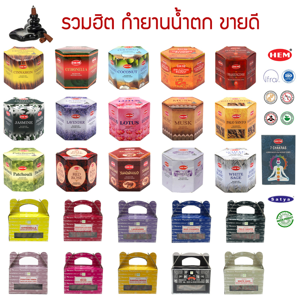 กำยานน้ำตกอินเดียเกรดพรีเมี่ยม รวมกำยานที่ดีที่สุด แบรนด์ Satya และ HEM - Backflow Incense Cones