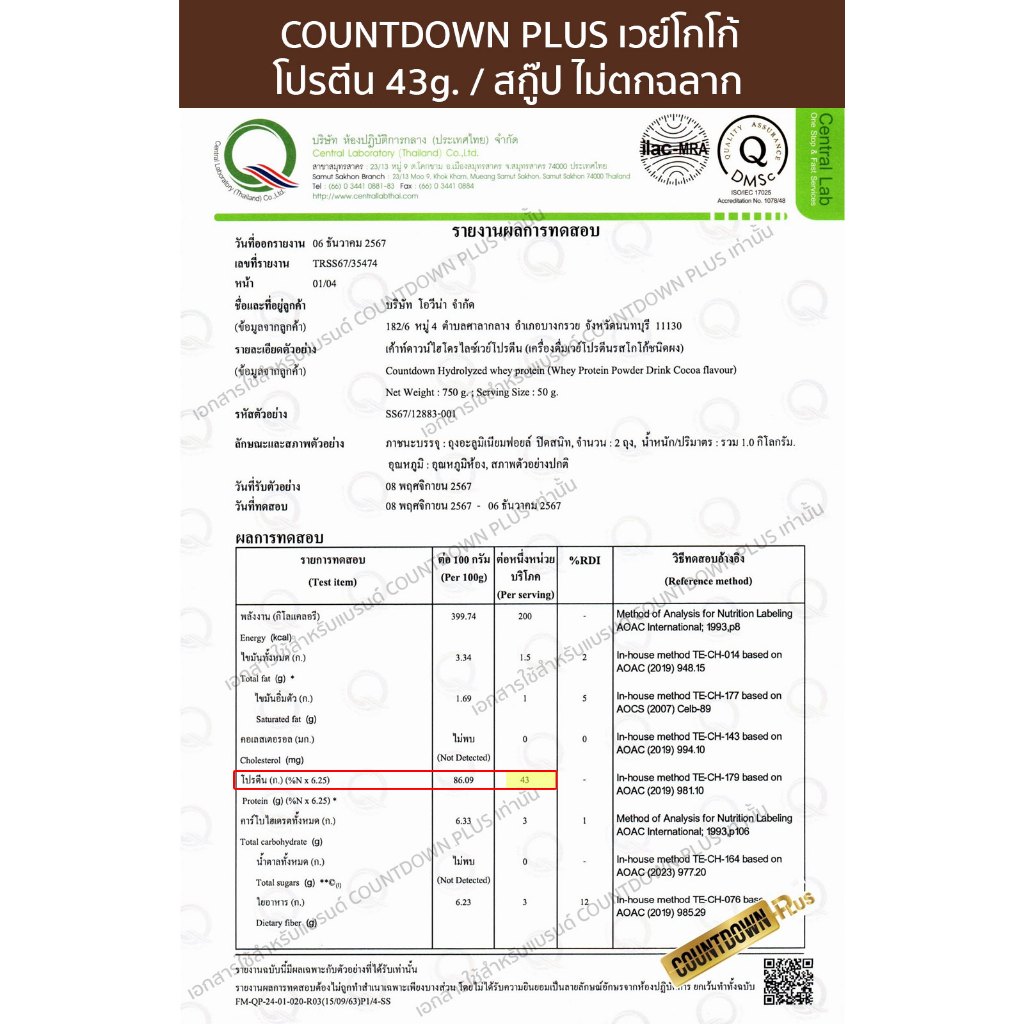 COUNTDOWN PLUS เวย์ไฮโดรไลซ์ รสโกโก้ 750g. โปรตีนสูง 43g. อร่อย ไม่เติมน้ำตาล ไม่หวาน ทานได้ 15 วัน