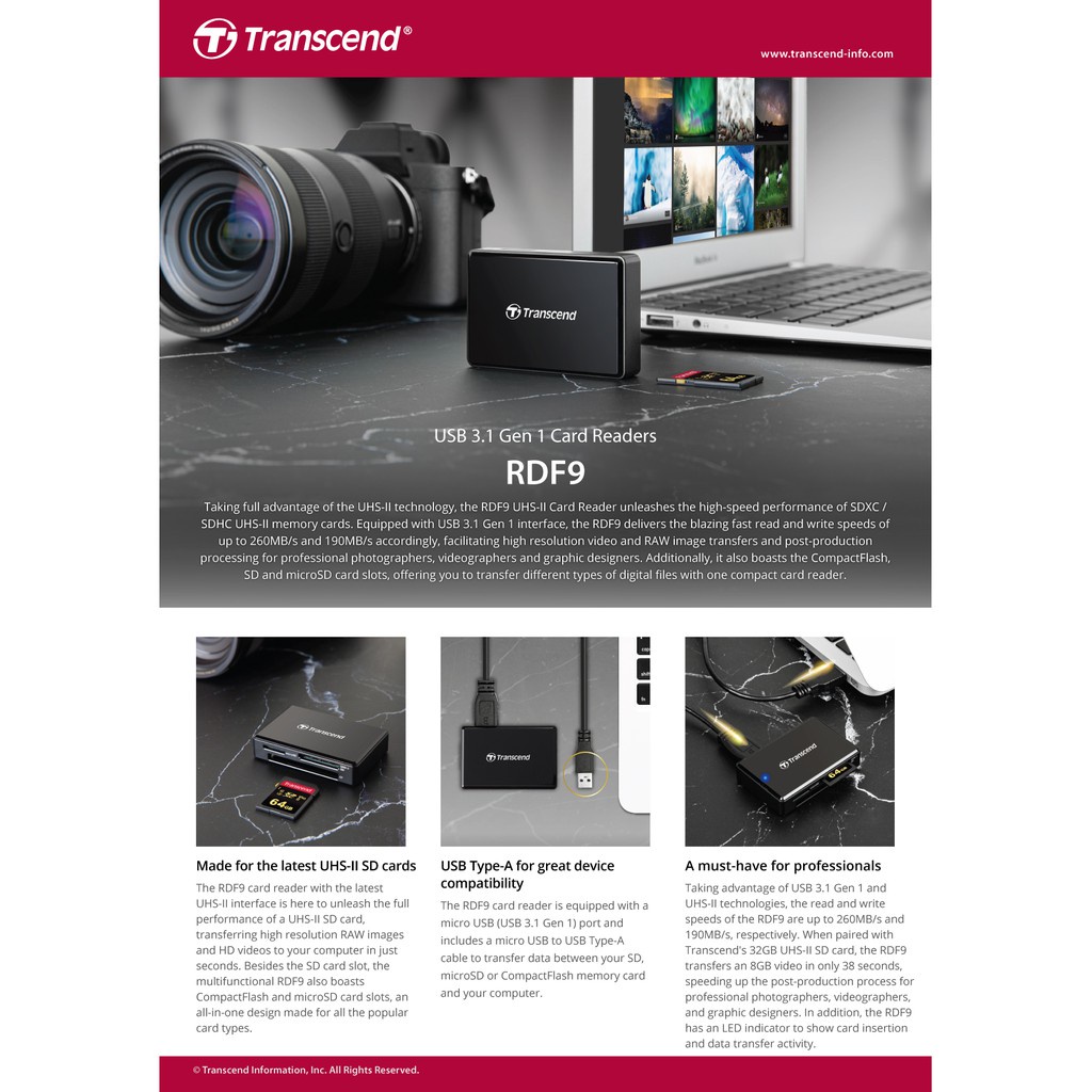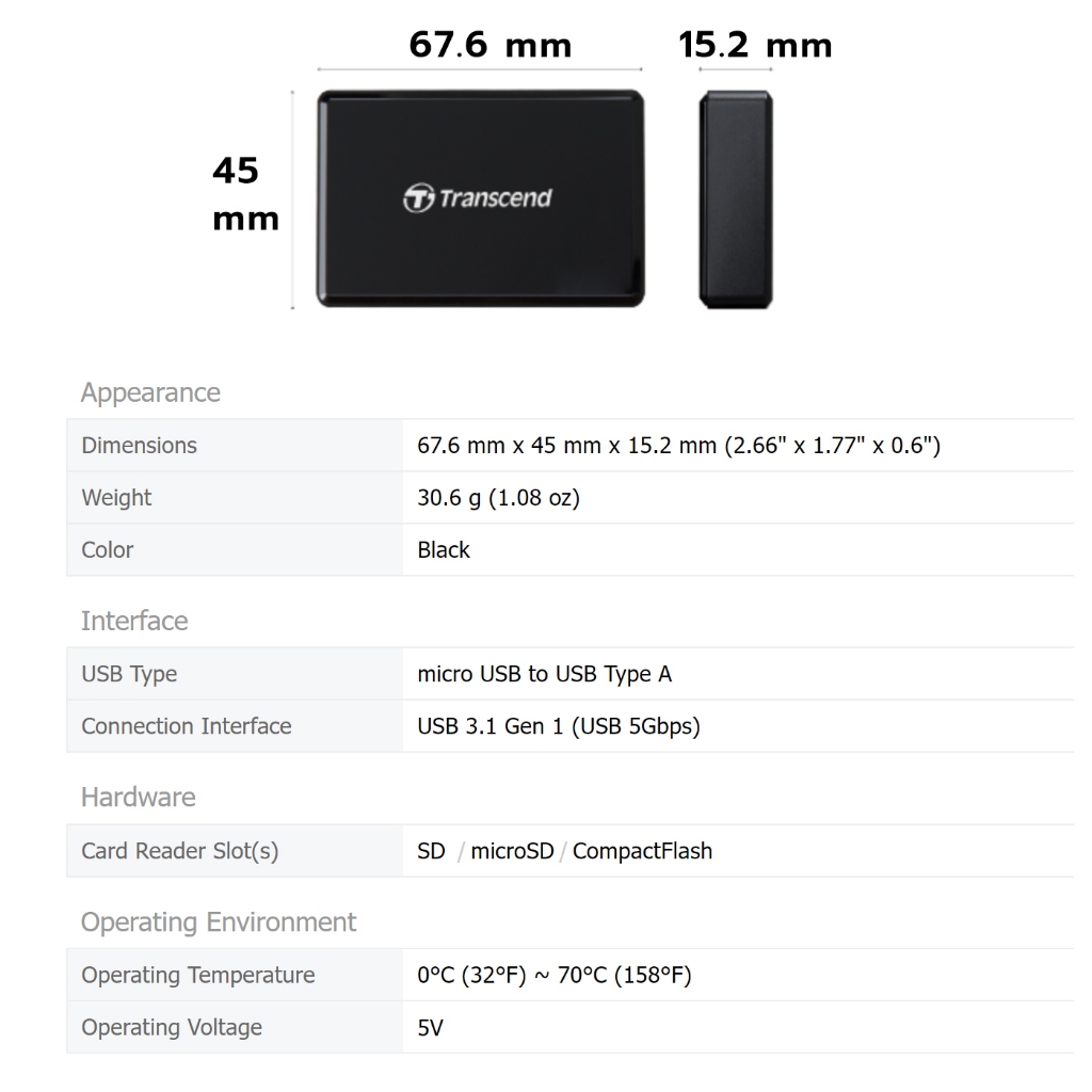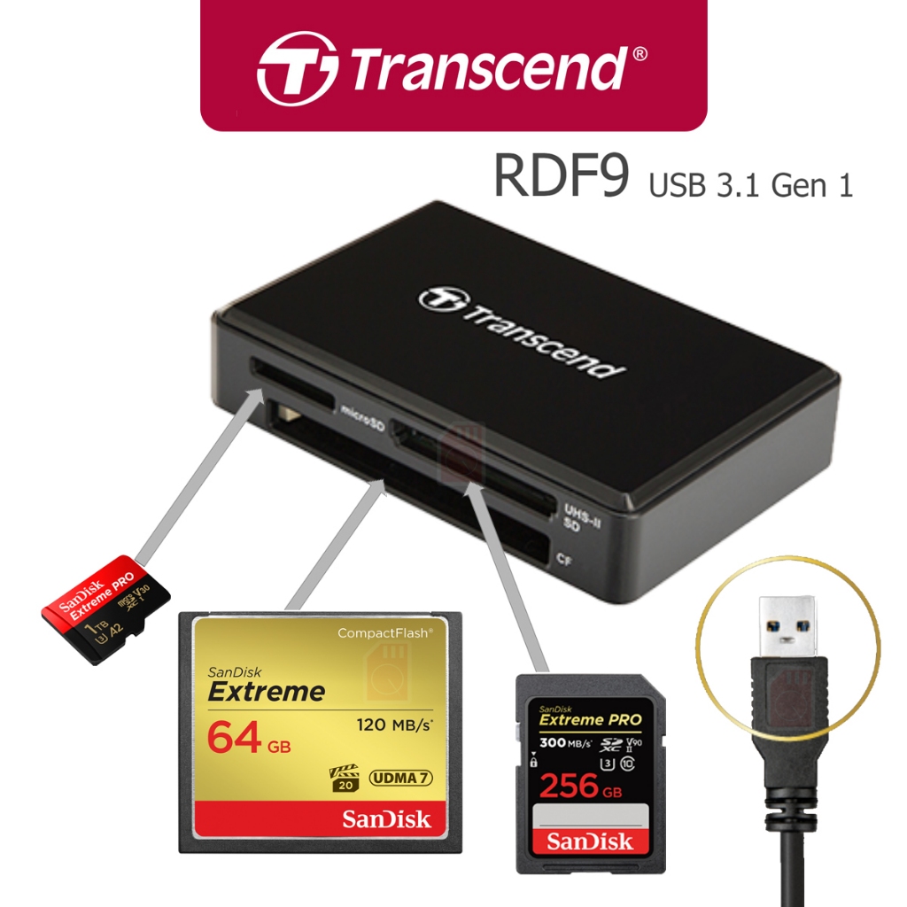 Transcend Card Reader RDF9 : USB 3.1 Gen 1 หัว USB A - รับประกัน 2 ปี - มีใบกำกับภาษี-TS-RDF9K2