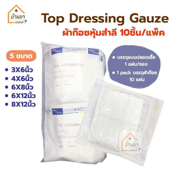 [1แพ็ค 10แผ่น] Top gauze ผ้าก๊อซหุ้มสำลี Top Dressing Gauze Sterile รุ่น Gamgee / N.W. Dressing Pad Thaigauze