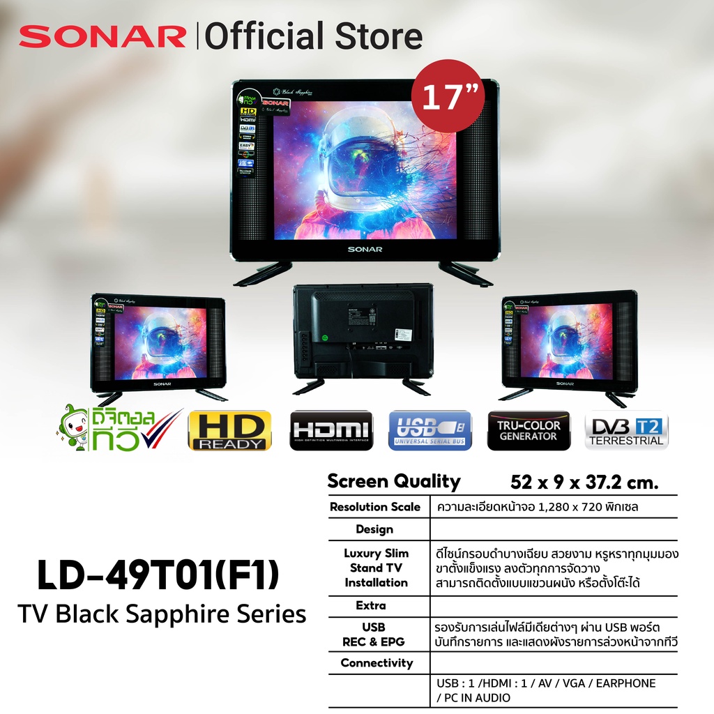 SONAR LED DIGITAL TV ทีวีดิจิตอล 17 นิ้ว รุ่น LD-49T01(F1) ไม่ต้องใช้กล่องต่อเพิ่ม โทรทัศน์