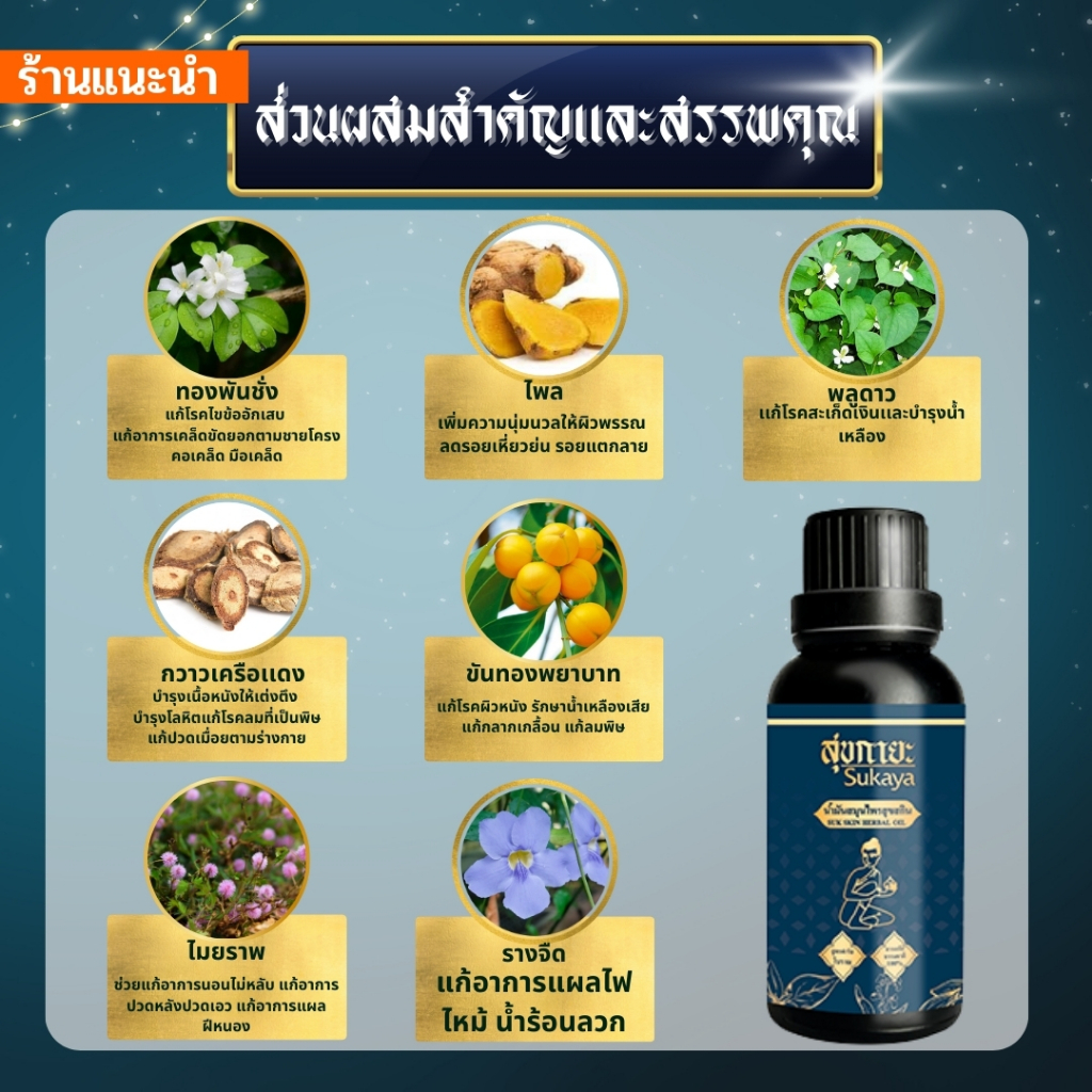 [แถมสบู่สุขกายะ 20g 1ก้อน !] Sukaya Massage Oil น้ำมันนวดคลายเส้น ตำรับวัดโพธิ์ นวดคลายปวดเมื่อย ขนาด 30 ml. 1ชิ้น