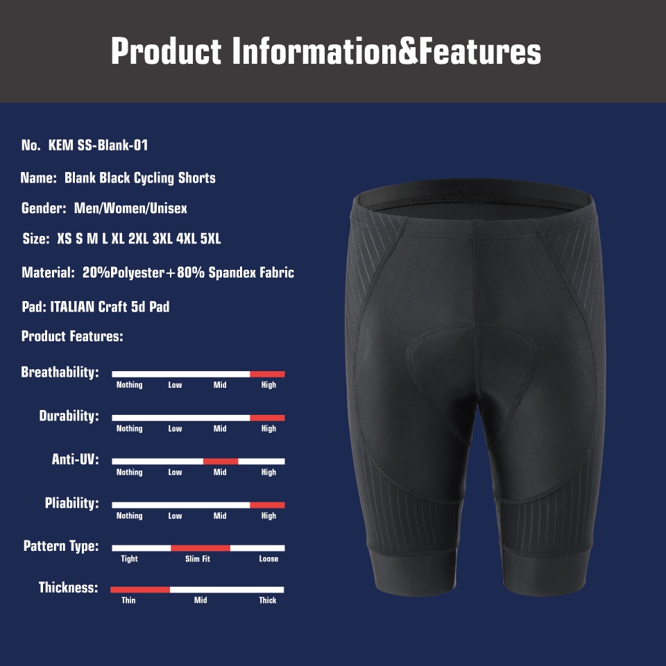 KEMALOCE กางเกงปั่นจักรยานผู้ชาย 5D เจลเบาะ Coolmax ระบายอากาศคุณภาพสูง กางเกงปั่นจักรยาน บีบอัด ไลคร่า ว่างเปล่า สีดำ