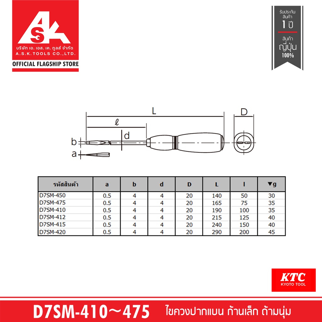KTC ไขควงปากแบน ก้านเล็ก ด้ามนุ่ม รหัสสินค้า D7SM-410 ~ 475