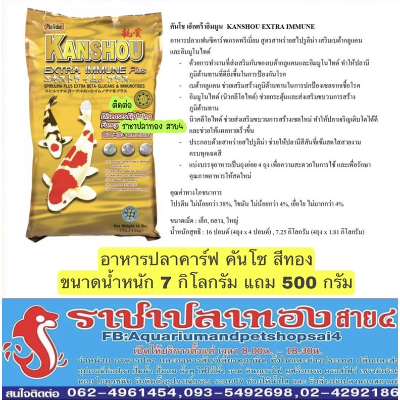 อาหารปลาคาร์ฟ คันโช สีทอง สาหร่าย12% ขนาดน้ำหนัก 7 กก.แถม 500 กรัม