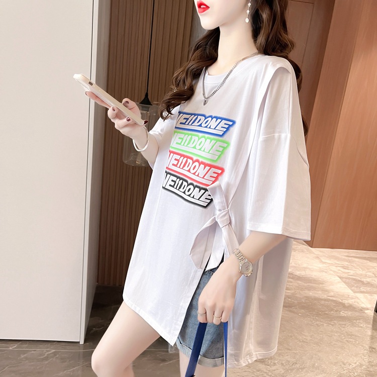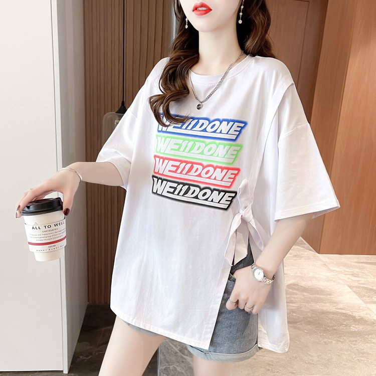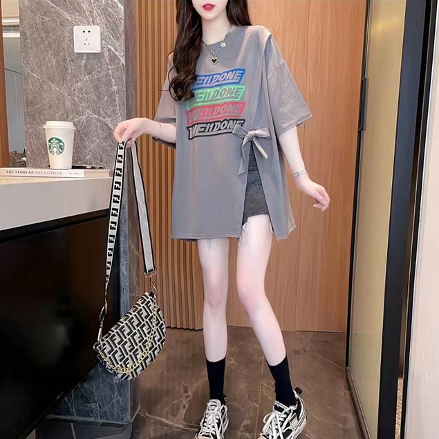 เสื้อแขนสั้น Oversize (อก 48 นิ้ว) คอกลม สกรีนลาย ผ่าข้างสูงผูกโบว์ ผ้าคอตตอล พร้อมส่ง A55