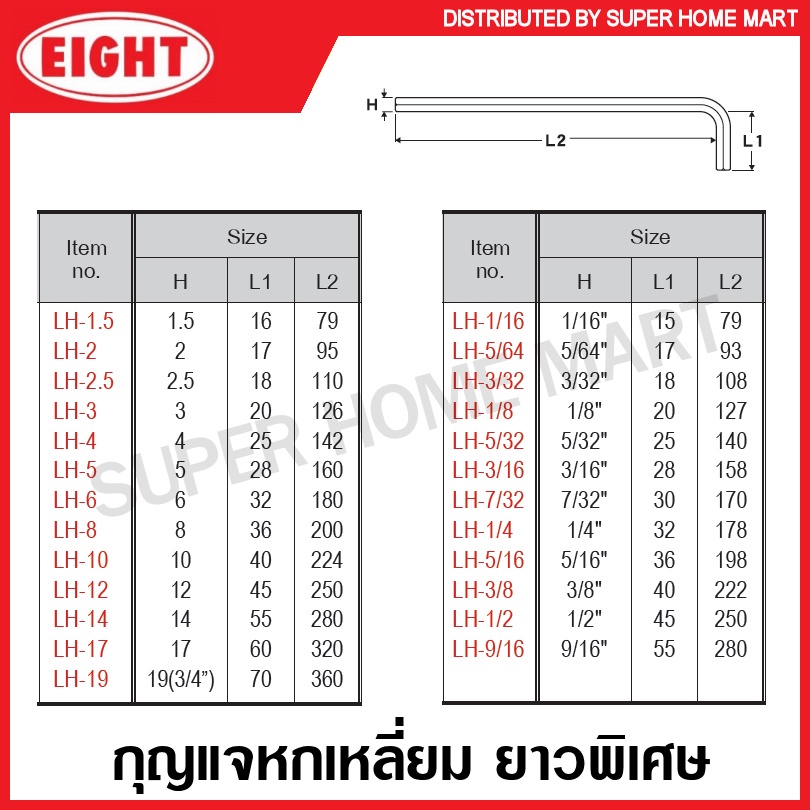 Eight กุญแจหกเหลี่ยม ยาวพิเศษ สีขาว (ตัวเดี่ยว) (มิล / นิ้ว) รุ่น LH ( Hex Key Wrench ) ประแจหกเหลี่ยม หกเหลี่ยม ประแจแอล