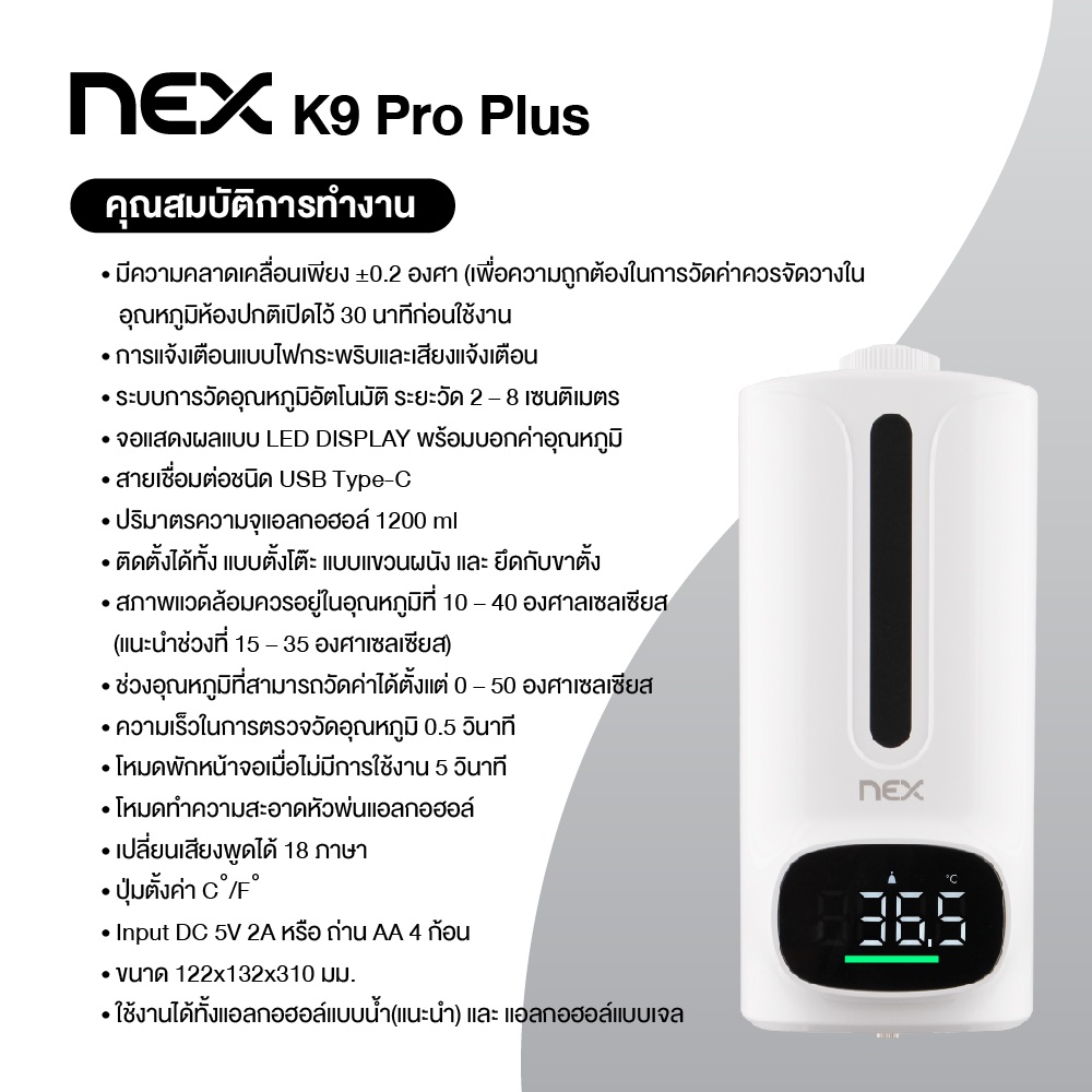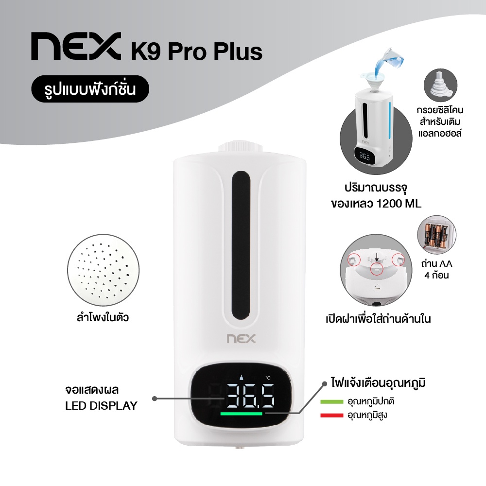 2 IN 1 เครื่องจ่ายแอลกอฮอล์พร้อมที่วัดอุณหภูมิอัตโนมัติ รุ่น K9 Pro Plus มีเสียงแจ้งเตือนภาษาไทย รับประกัน 1 ปี