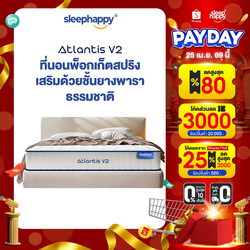 SleepHappy ที่นอนยางพาราและพ็อกเก็ตสปริง ผสานนวัตกรรมชาโคล รุ่น Atlantis V2 หนา 10 นิ้ว สัมผัสนุ่มเด้ง ขนาด 6 ฟุต