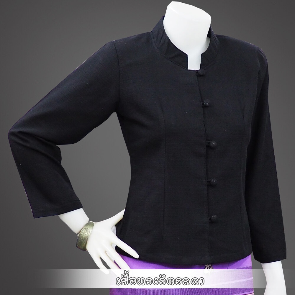 ( ม่อฮ่อมแพร่ ) เสื้อไทยทรงจิตรลดา แขนยาว เสื้อพื้นเมืองหญิง ชุดดำ ผ้าดำ ผ้าฝ้ายชินมัย สีดำ