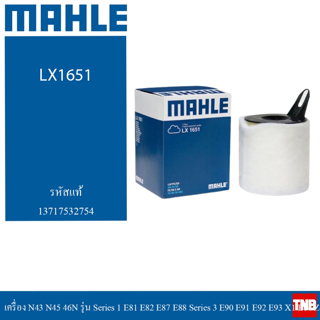 MAHLE กรองอากาศ BMW เครื่อง N43 N45 46N รุ่น Series 1 E81 E82 E87 E88 Series 3 E90 E91 E92 E93 X1 E84 Z4 E85 LX 1651