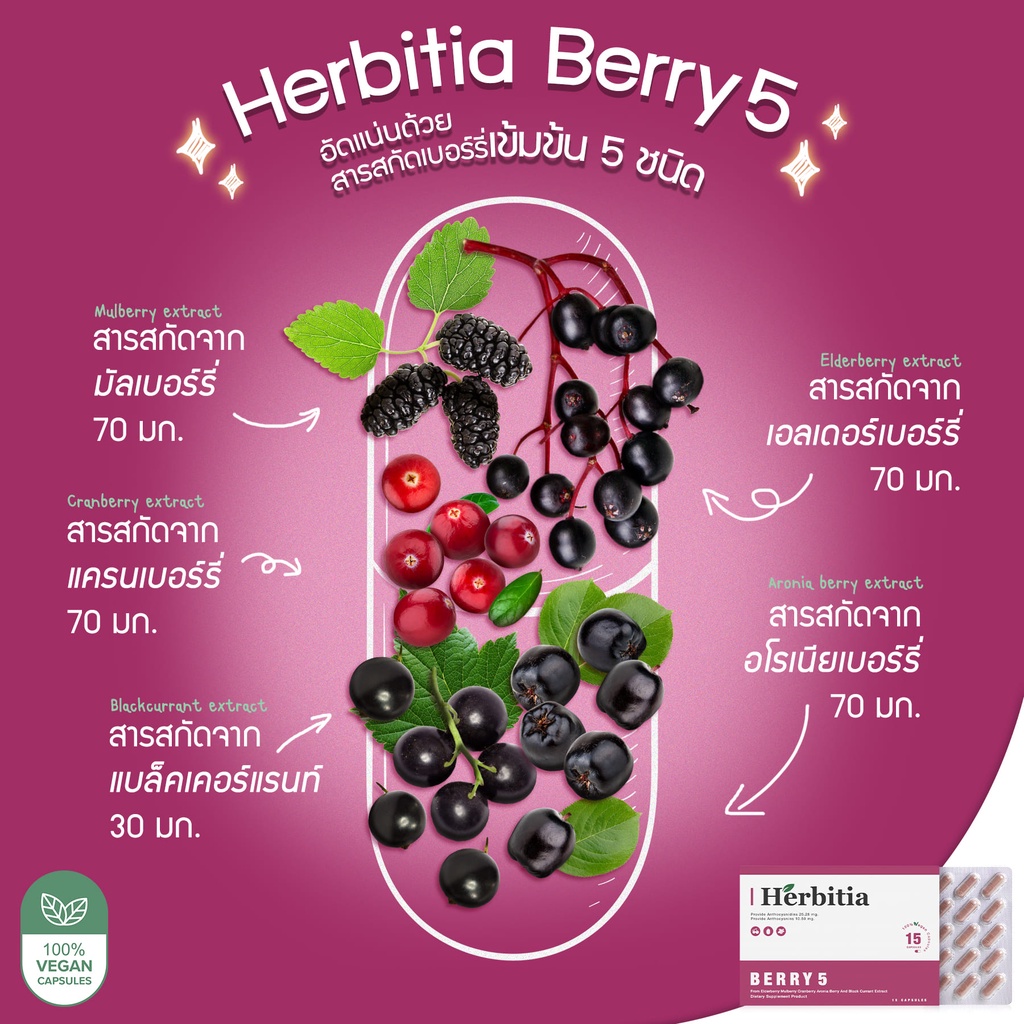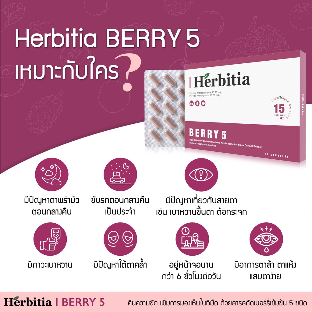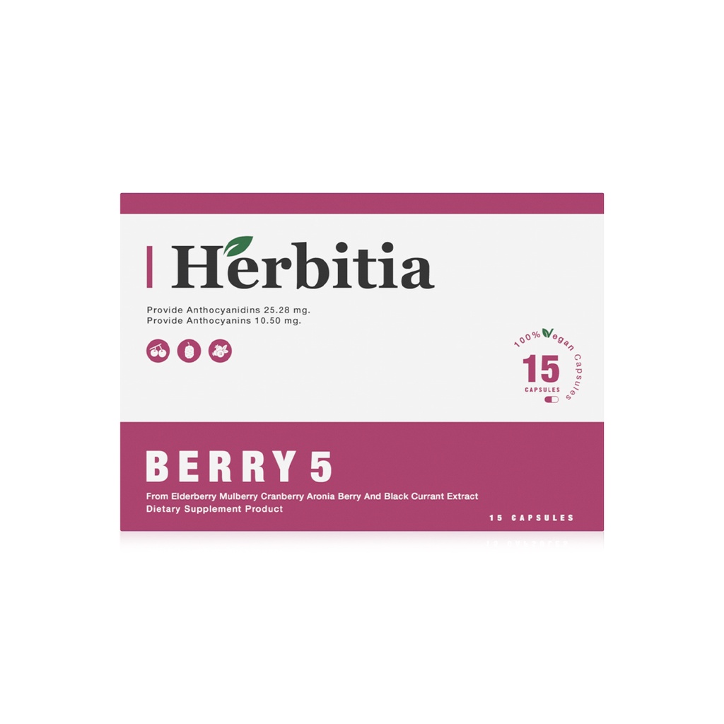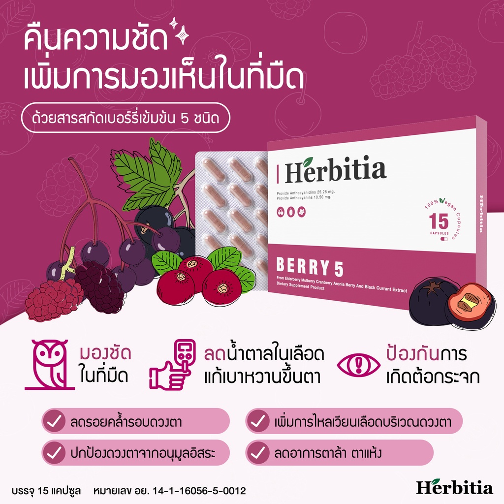 [1 แถม 1*] Herbitia Berry 5 เฮอร์บิเทีย เบอร์รี่ 5 คืนความชัด เพิ่มการมองเห็นในที่มืด วิตามินเพิ่มการมองเห็น 15 แคปซูล