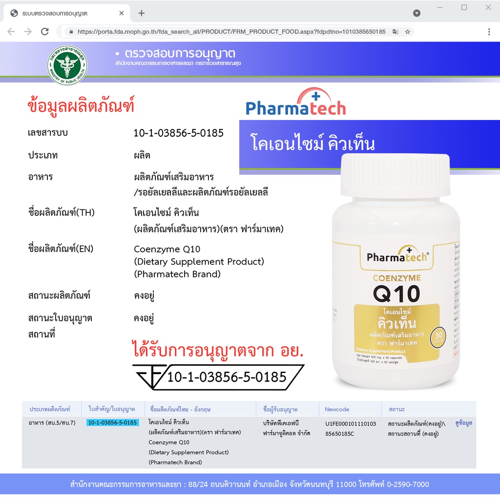 Q10 x 1 ขวด โคเอนไซม์ คิวเท็น ฟาร์มาเทค Coenzyme Q10 Pharmatech คิวเทน โคคิวเทน โคคิวเท็น CoQ10