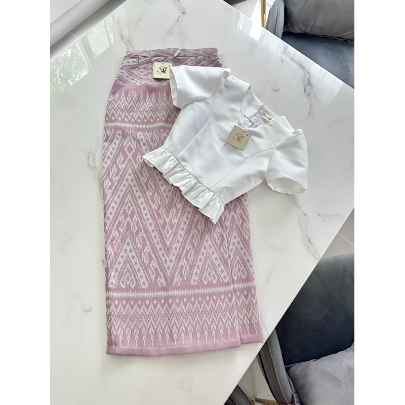 ชุดไทย เสื้อผ้าไหมสีขาว ผ้าถุงสำเร็จรูปทอลายลิซ่าสีกรม ผ้าถุงสำเร็จรูปทอลายลิซ่าสีชมพู