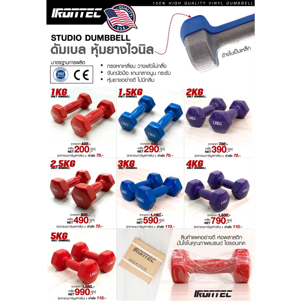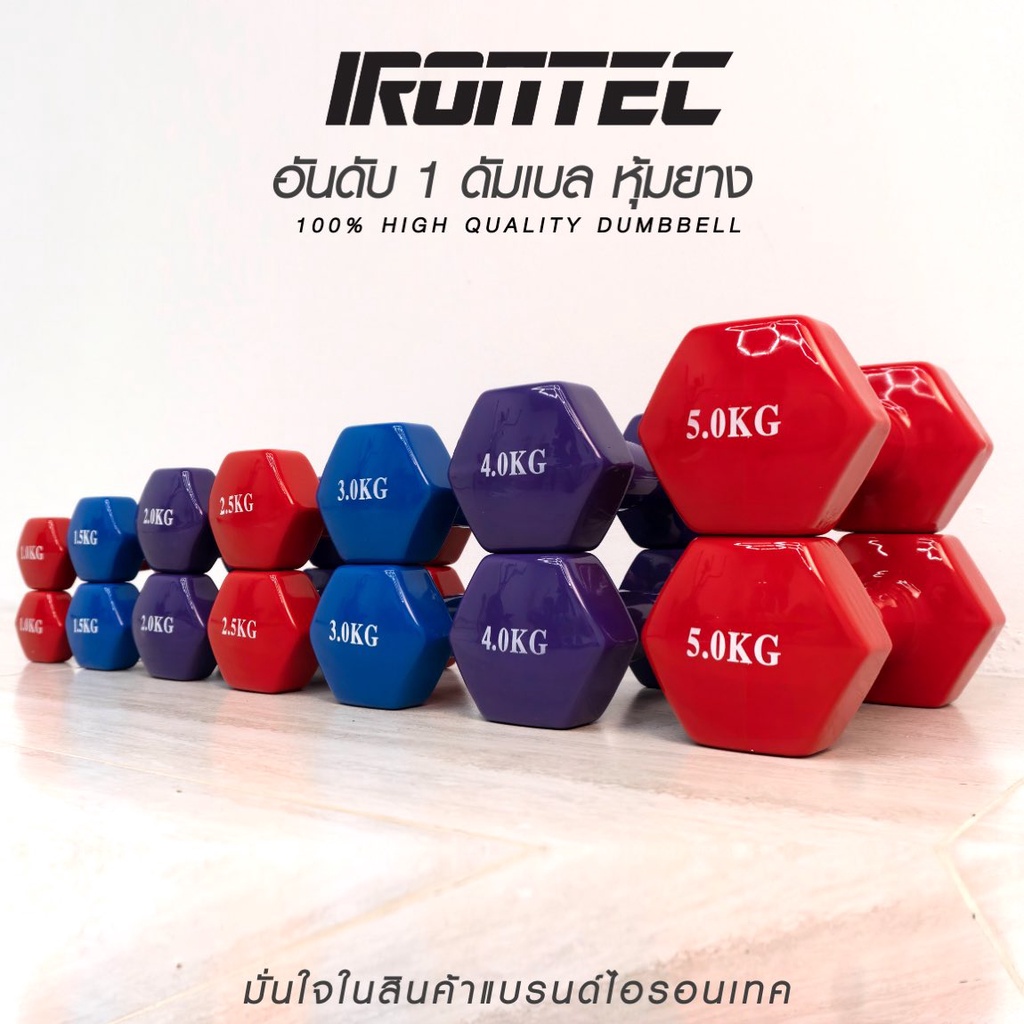 Dumbbell ดัมเบล หุ้มยางไวนิลสีแดง ขนาด 1กิโล (1 คู่) - เครื่องออกกำลังกาย แบรนด์ IRONTEC