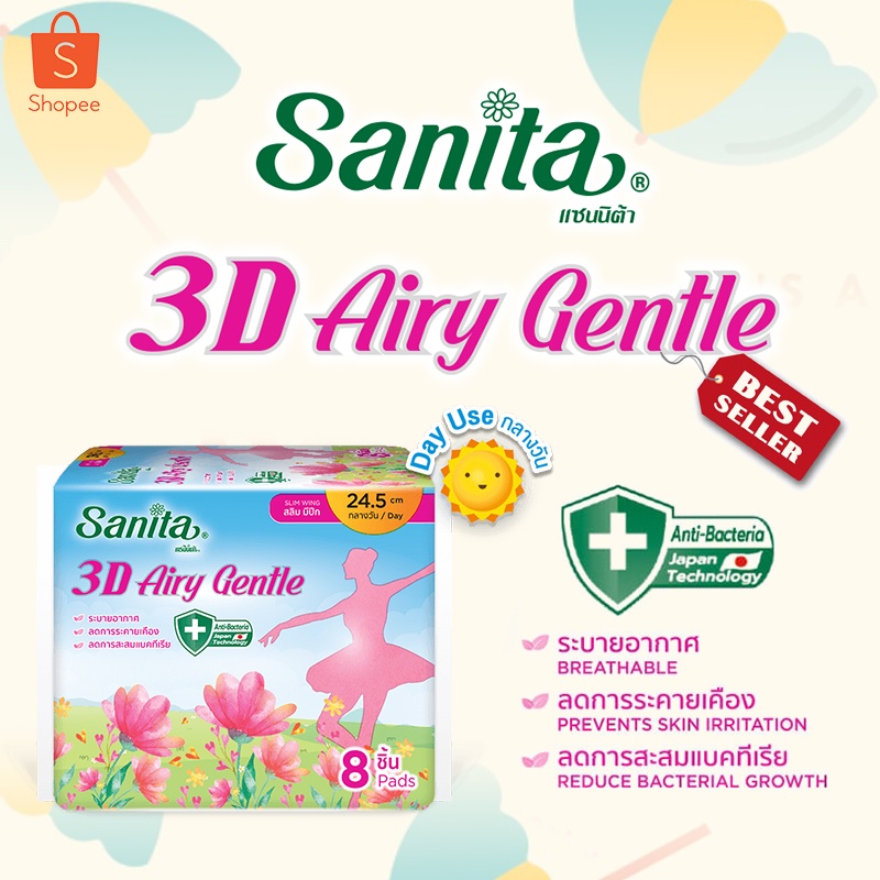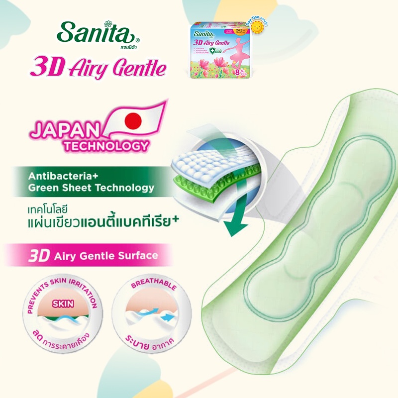 [ยกโหล12ห่อ] Sanita 3D Airy Gentle /แซนนิต้า 3D แอรี่ เจนเทิล สลิม มีปีก 24.5ซม. 4ชิ้น/ห่อ