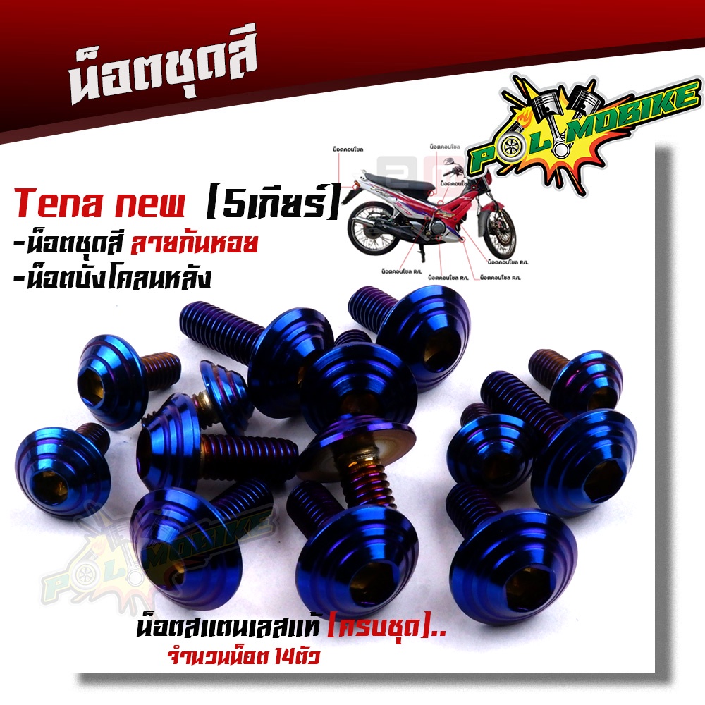 น็อตชุดสี TENA NEW 5เกียร์ (1ชุด14ตัว) เลสแท้100% น็อตก้นหอย ครบชุดรวม น็อตบังโคลน น็อตเฟรมเทน่า น็อตชุดสีเทน่า