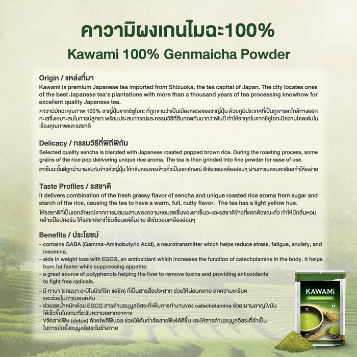 คาวามิ เกนไมฉะ ชนิดผง100% ขนาด 100 กรัม. KAWAMI Genmaicha Powder 100% size 100 g.