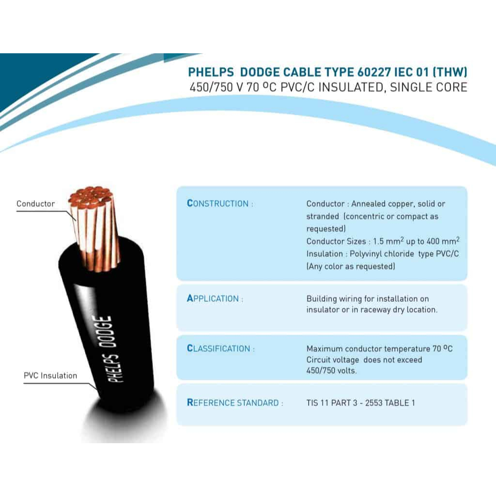 สายตัด (100m/ม้วน) [ของแท้ "Phelps Dodge"] สายไฟ 60227 IEC 01 THW ขนาด 1x4 sq.mm.