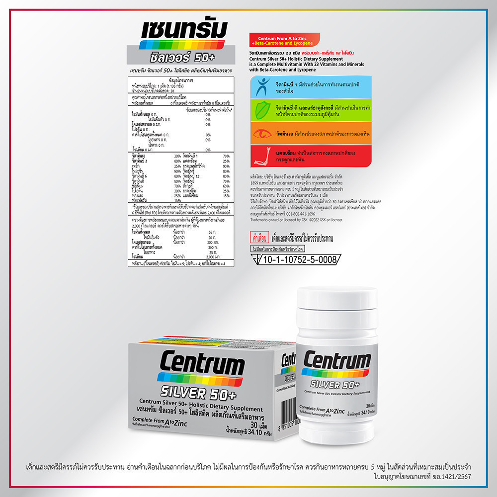 [ส่งฟรี] CENTRUM SILVER 50+ HOLISTIC 30เม็ด x2 เซนทรัมซิลเวอร์50+ โฮลิสติค ผลิตภัณฑ์เสริมอาหารวิตามินรวมสำหรับอายุ50+