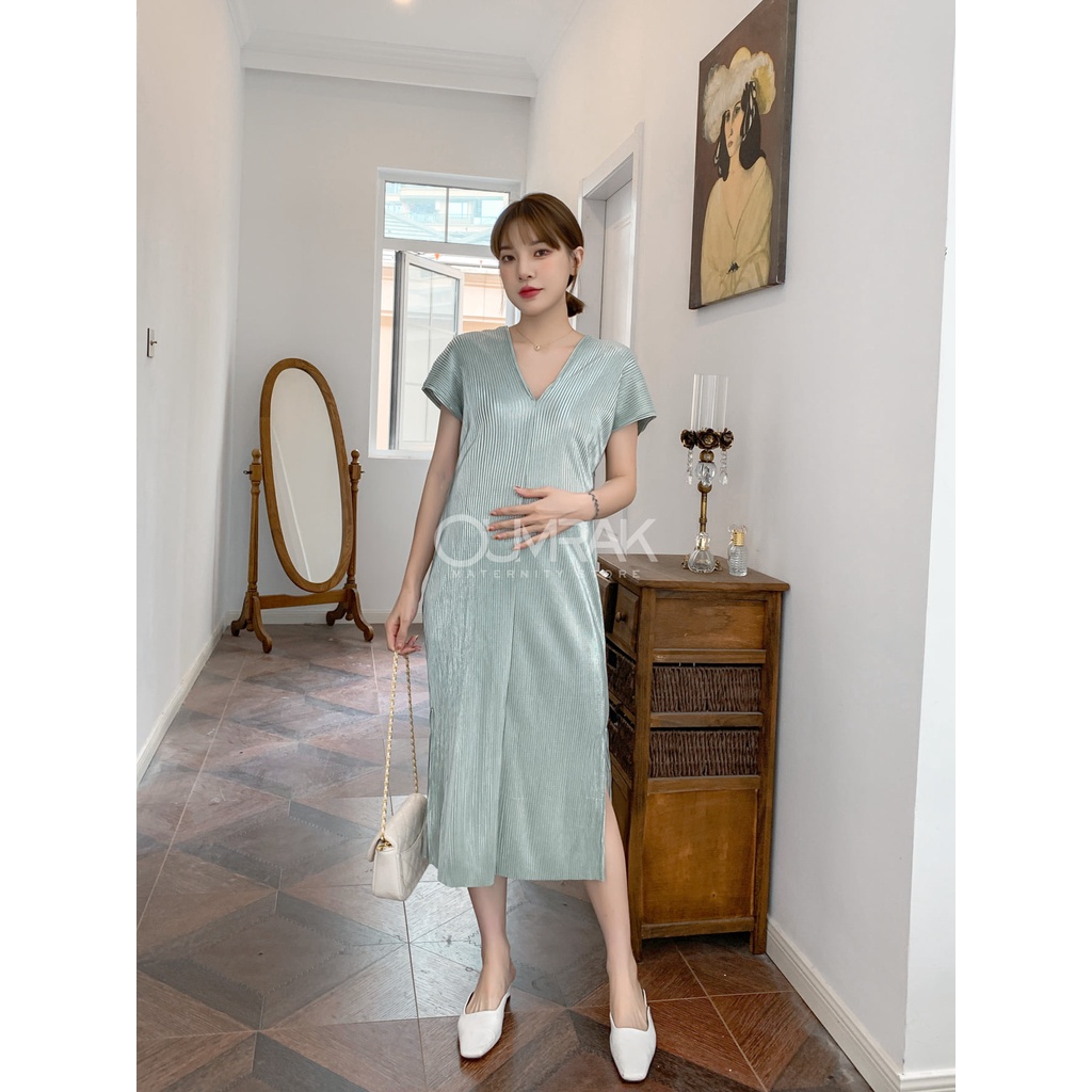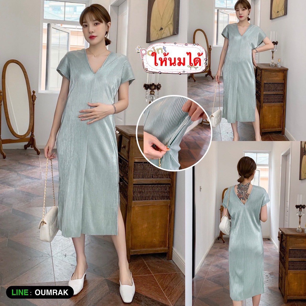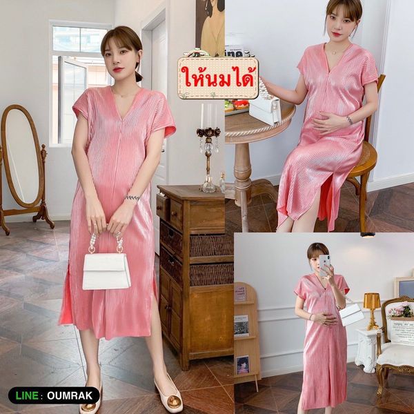 BE1083 (ให้นมได้ ) ชุดเดรสคลุมท้องผ้าซิลล์อัดพรีท