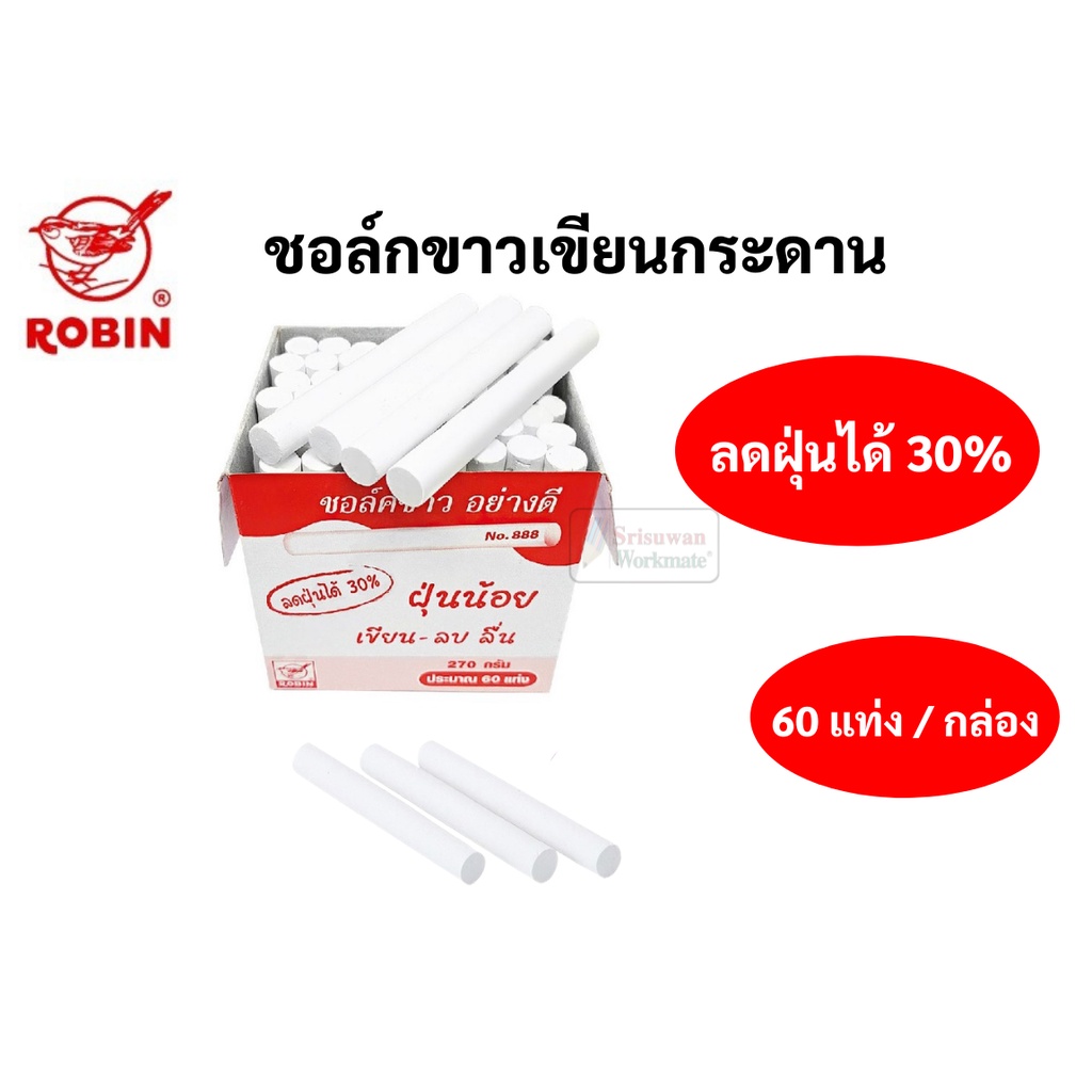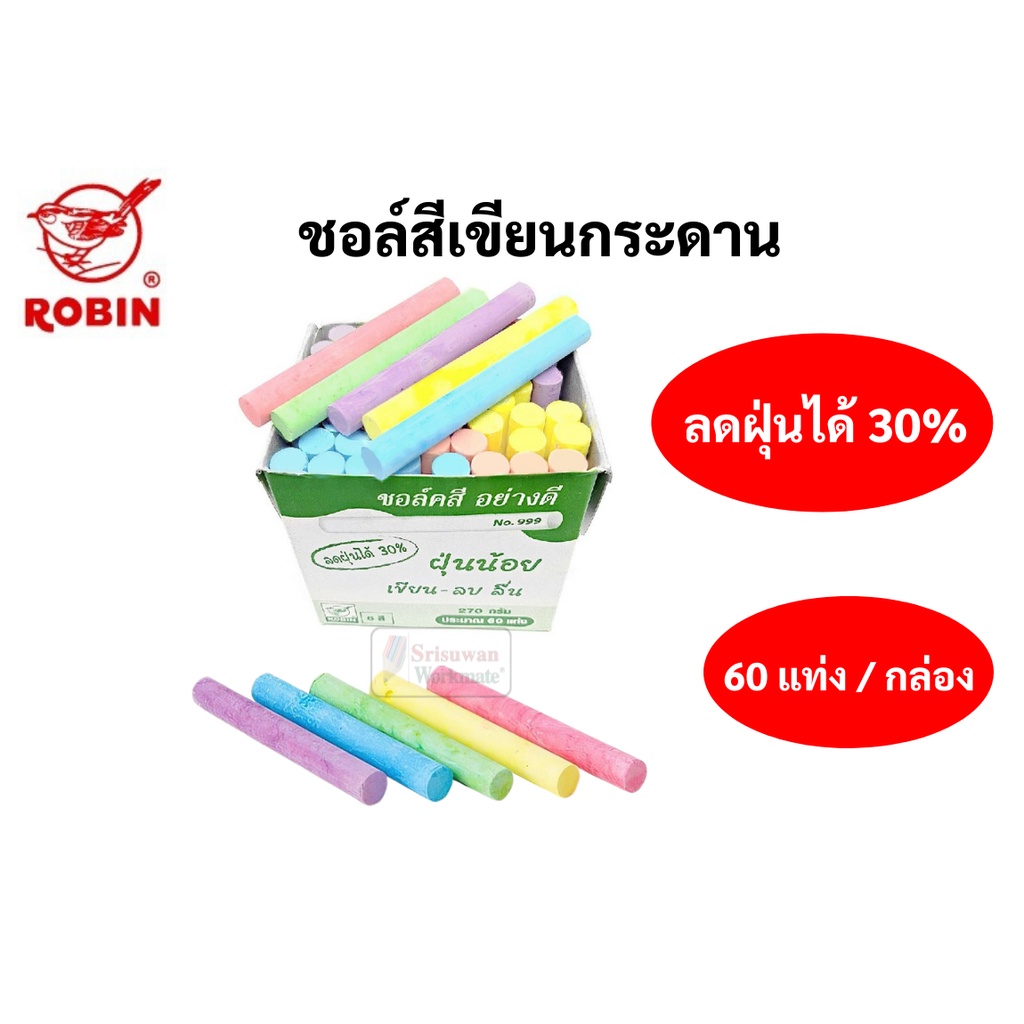 Robin ชอล์คเขียนกระดาน สีขาว / คละสี ไร้สารพิษ ฝุ่นน้อย บรรจุ 60 แท่ง/กล่อง ชอล์ค โรบิน ชอล์คขาว / ชอล์คสี No.888 No.999