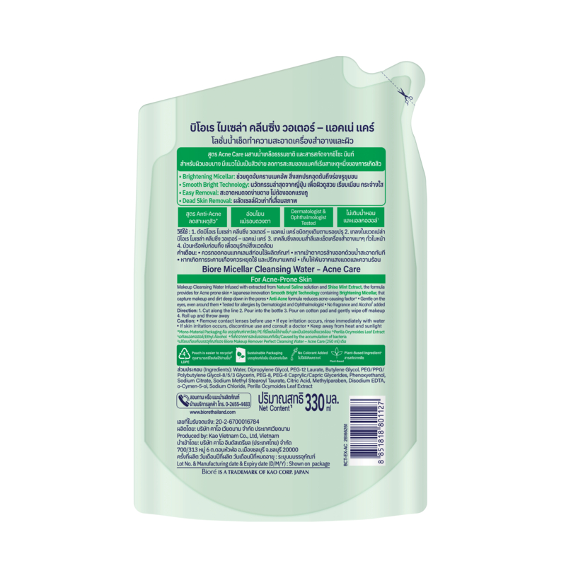 [แพ็ค2] Biore Micellar Cleansing Water Acne Care บิโอเร ไมเซล่า คลีนซิ่ง วอเตอร์ สูตร แอคเน่ แคร์ 330มล. (ถุงเติม)