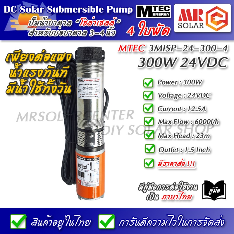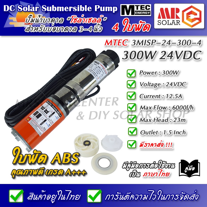 [แนะนำ] MTEC ปั๊มน้ำ ปั๊มบาดาล 24VDC 300W รุ่น 3MISP-24-300-4 ใบพัด ABS จำนวน 4 ใบ - DC Solar Submersible Pump