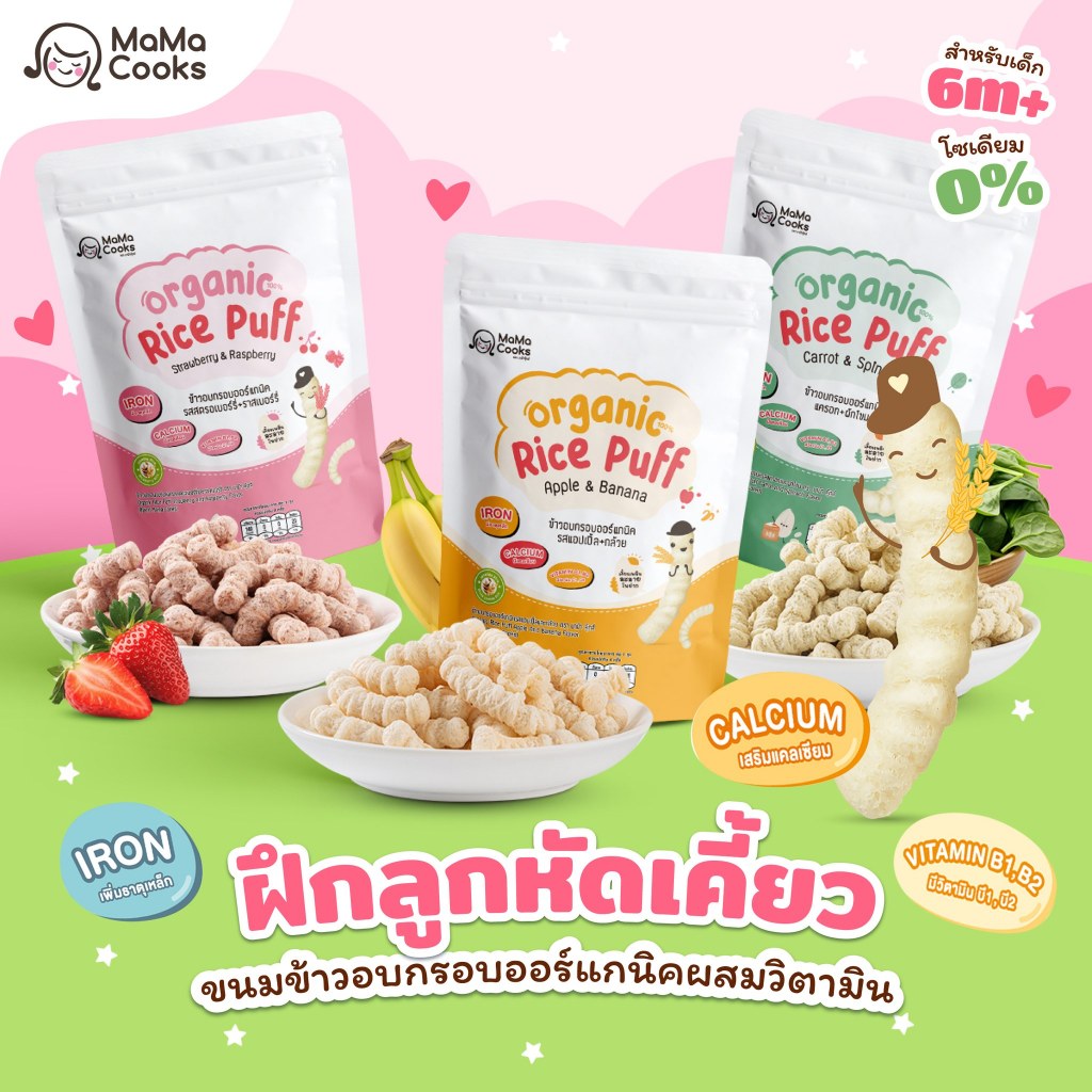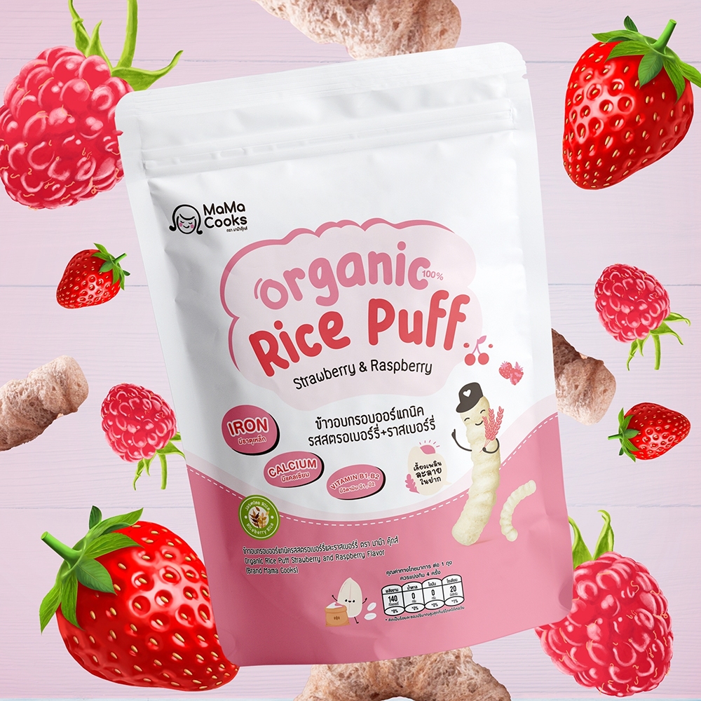 Mama Cooks ขนมข้าวอบกรอบ ออร์แกนิค รสสตอเบอรี่ + ราสเบอร์รี่ ขนมเด็ก เสริมวิตามิน ธาตุเหล็ก แคลเซียมสูง อาหารเด็ก 6m+