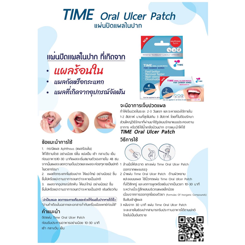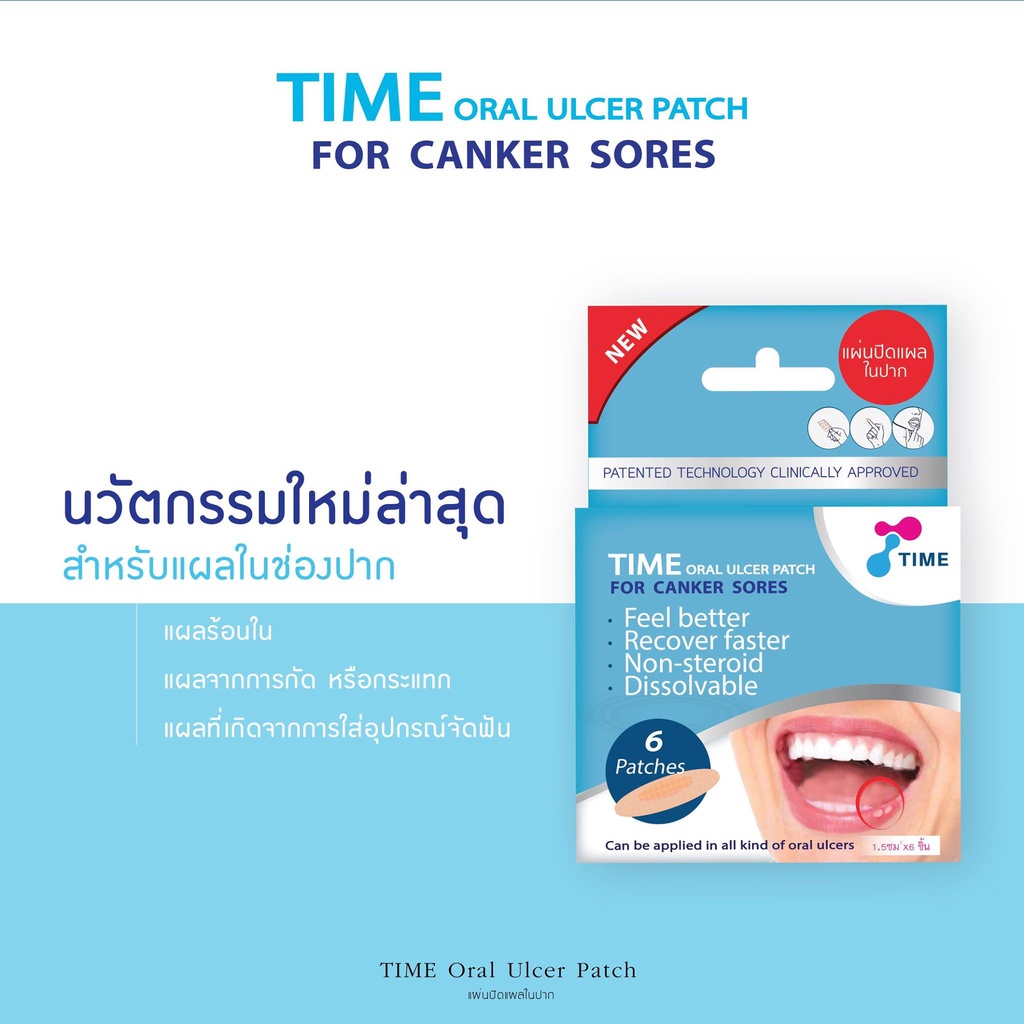 แผ่นแปะร้อนในแบบละลาย TIME ORAL ULCER PATCH ร้อนใน (แบบบรรจุ 4 ชิ้น และ รุ่นกล่อง บรรจุ 6 ชิ้น)