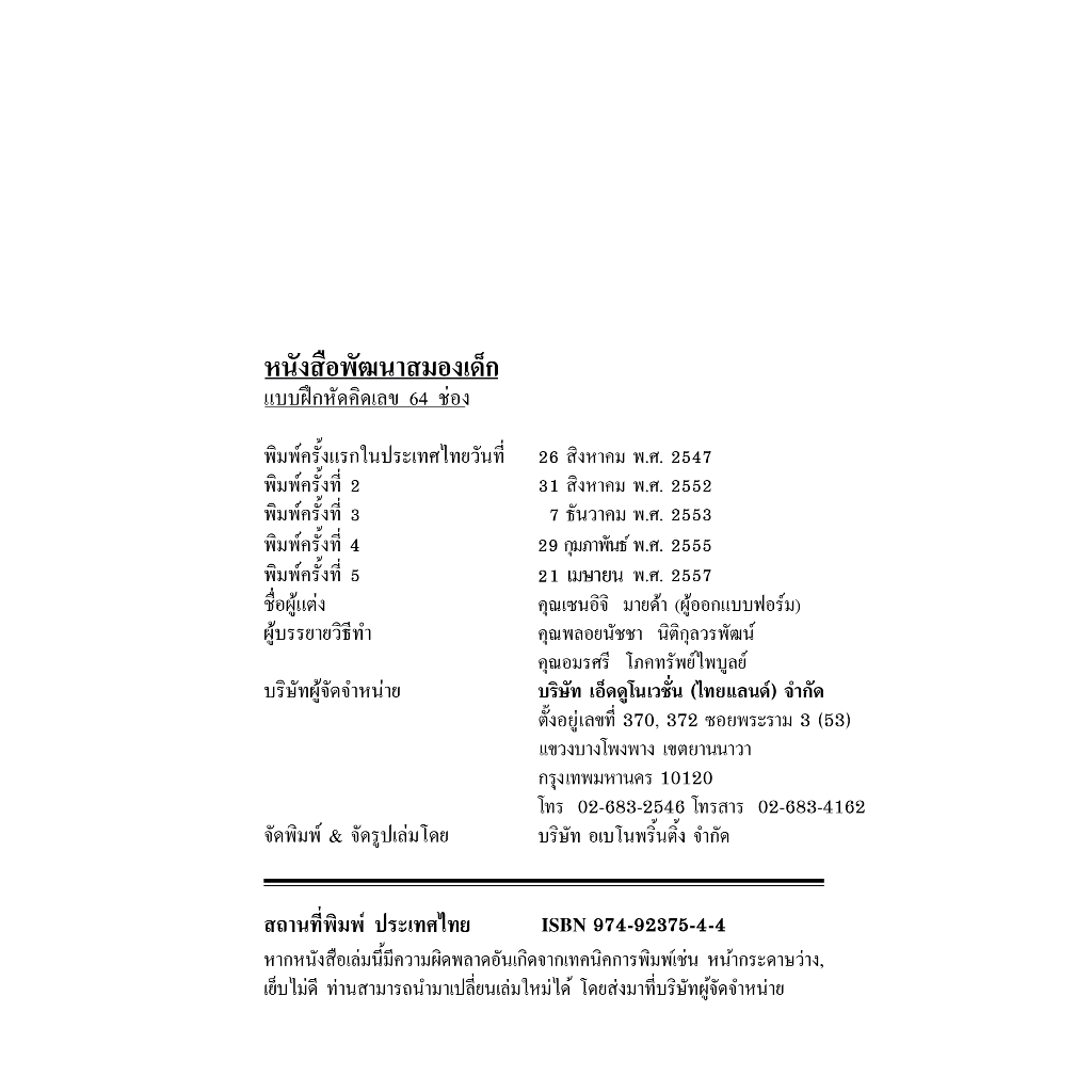 แบบฝึกหัดคำนวณแบบตอกย่ำ 64 ช่อง เล่ม 1 เสริมพัฒนาแก่เด็กในวัย 3-12 ปี