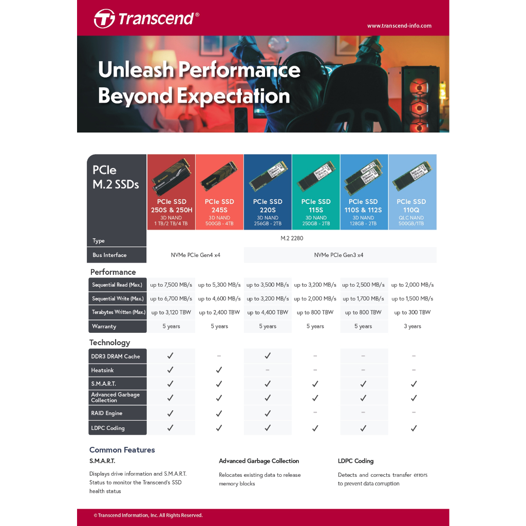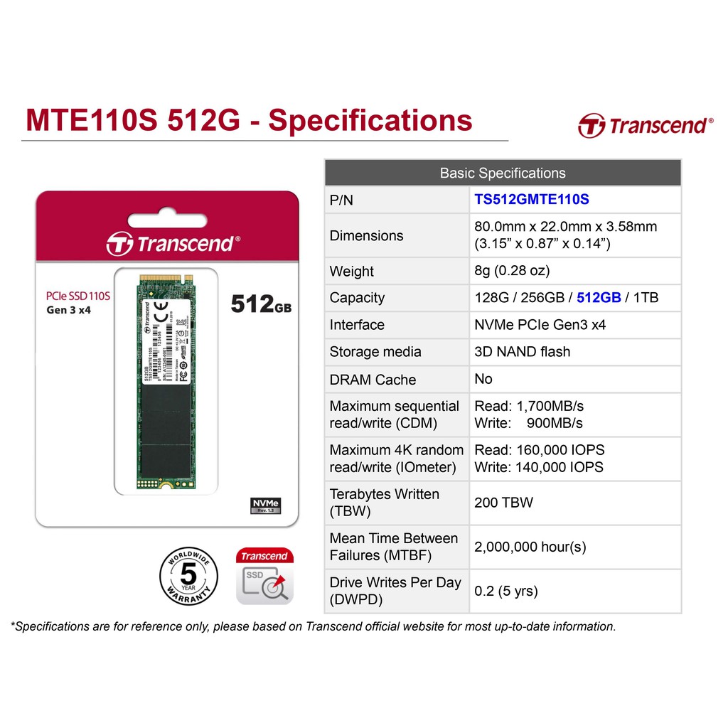 Transcend PCIe NVMe M.2 SSD 512GB :MTE110S:Gen3 x4:รับประกัน 5 ปีหรือ*รับประกันไม่เกิน200TBW มีใบกำกับภาษี-TS512GMTE110S