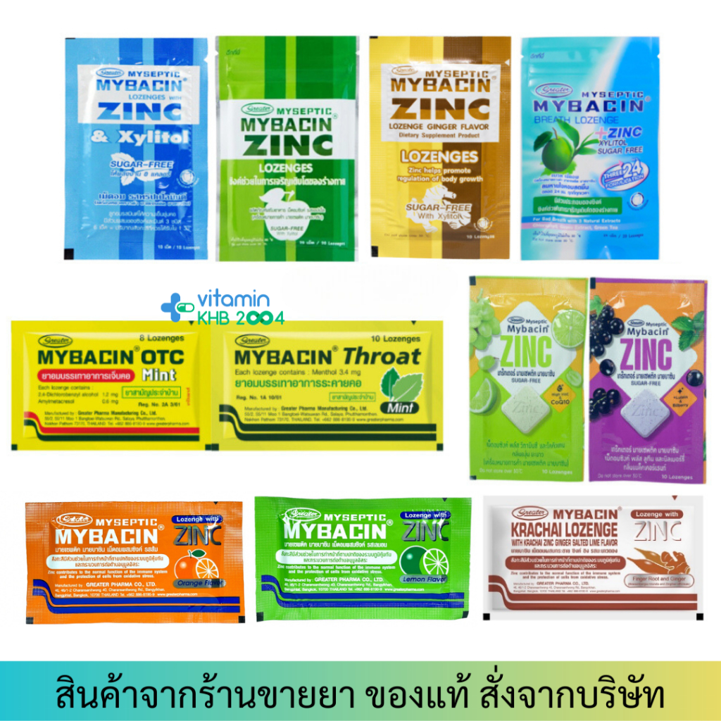 Mybacin เม็ดอมมายบาซิน ยาอม บรรเทาอาการเจ็บคอ OTC Mint และ THROAT Mint Zinc & Xylitol Sugarfree