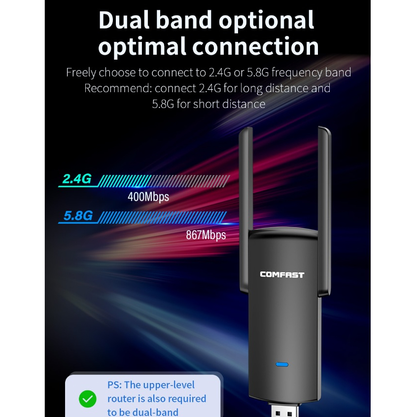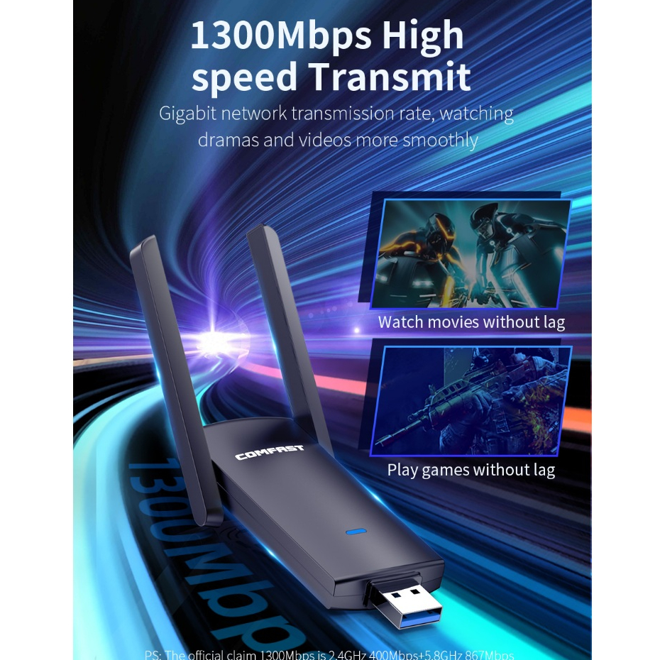 Comfast Gigabit 1300Mbps ตัวรับสัญญาณ wifi คอมพิวเตอร์ 5GHz 2 เสาอากาศเพิ่มเติม USB WiFi Dongle 11AC MU-MIMO Wi-Fi Win8/10/11 CF-924AC