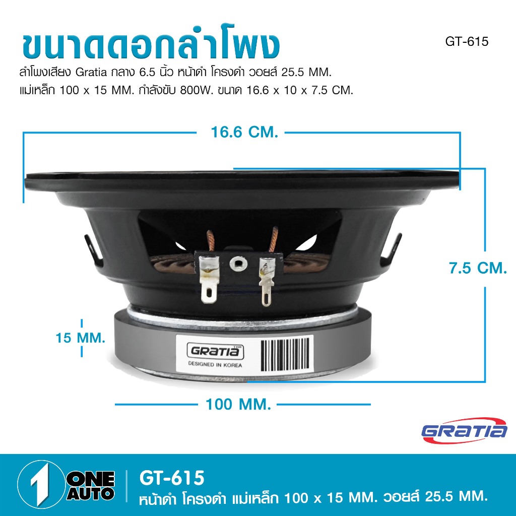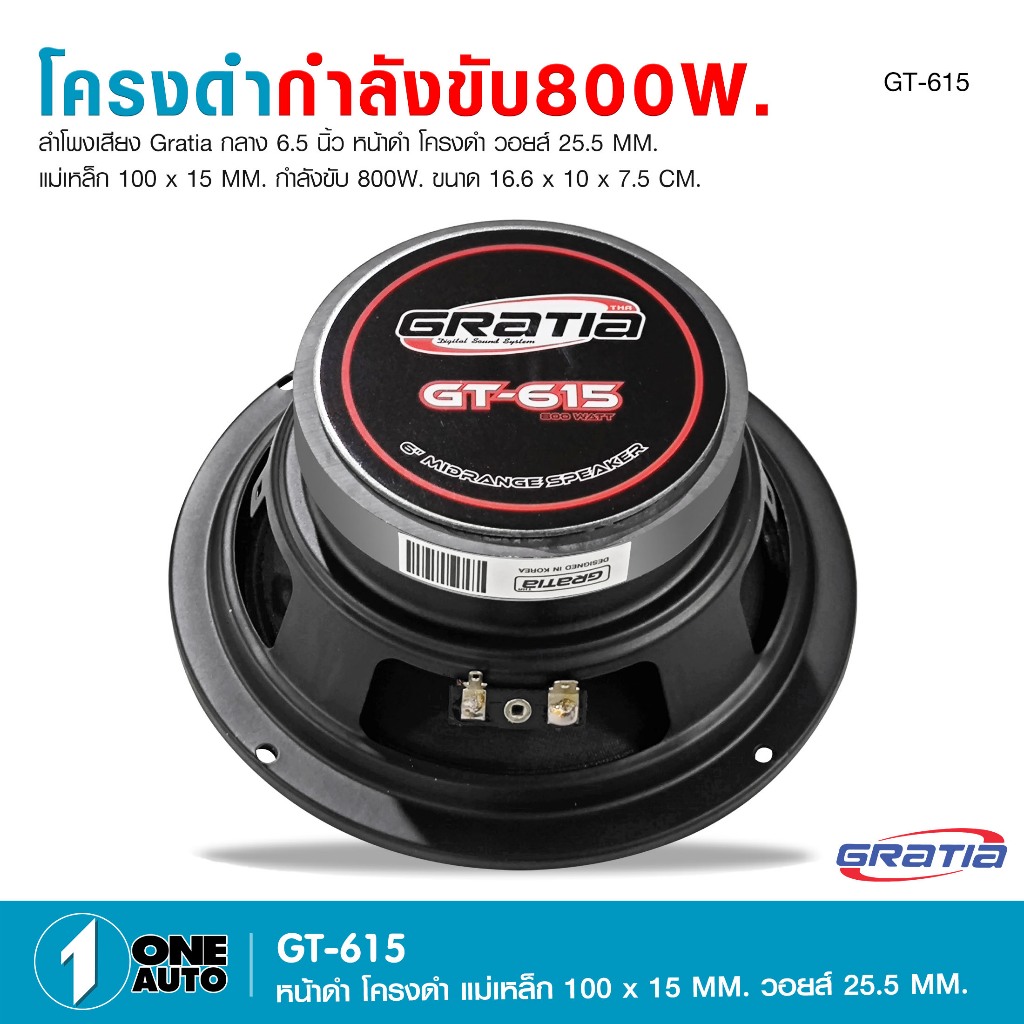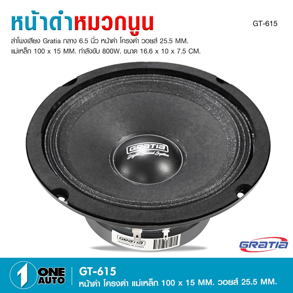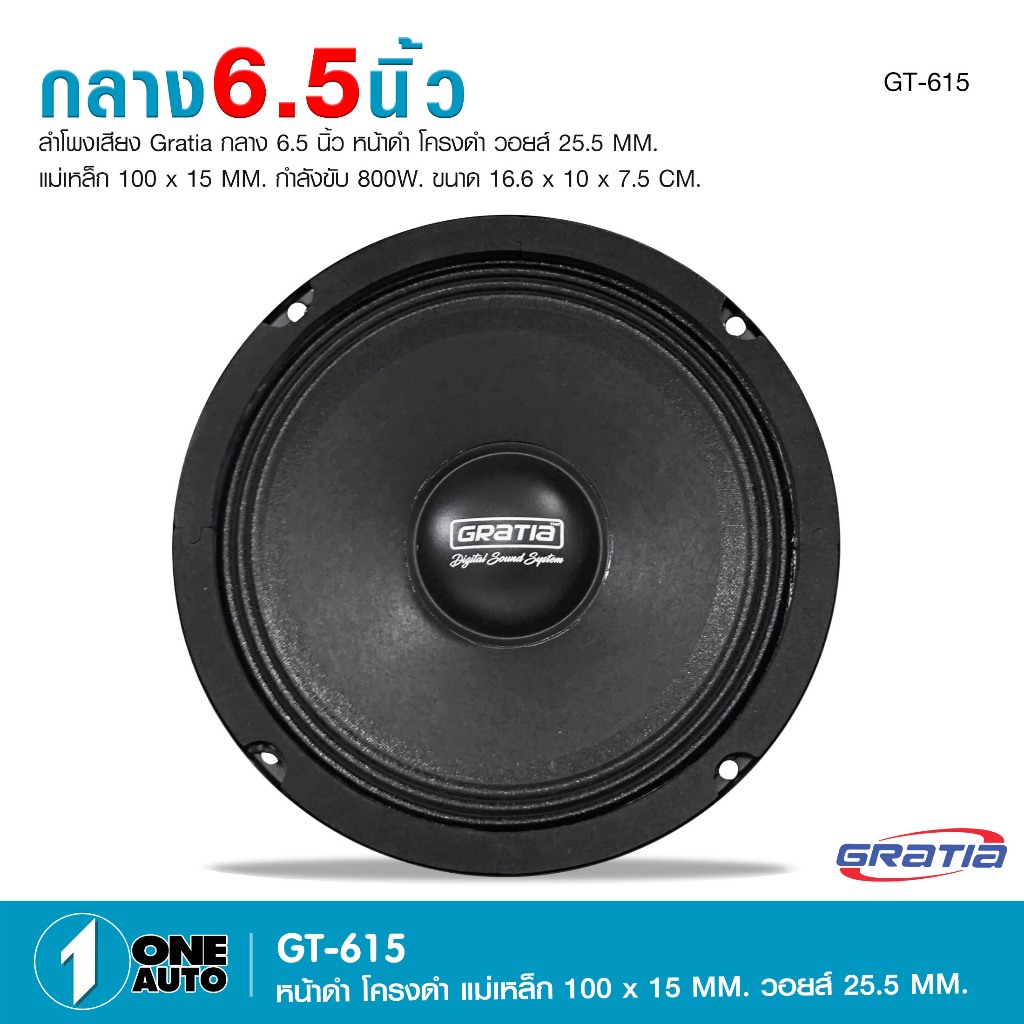1autoshop_thลำโพงเสียงกลาง6.5นิ้ว Gratia รุ่น GT-615 แม่เหล็ก100x15mm กำลังขับ800w มี1/2 ดอกให้เลือก