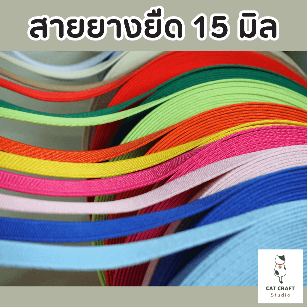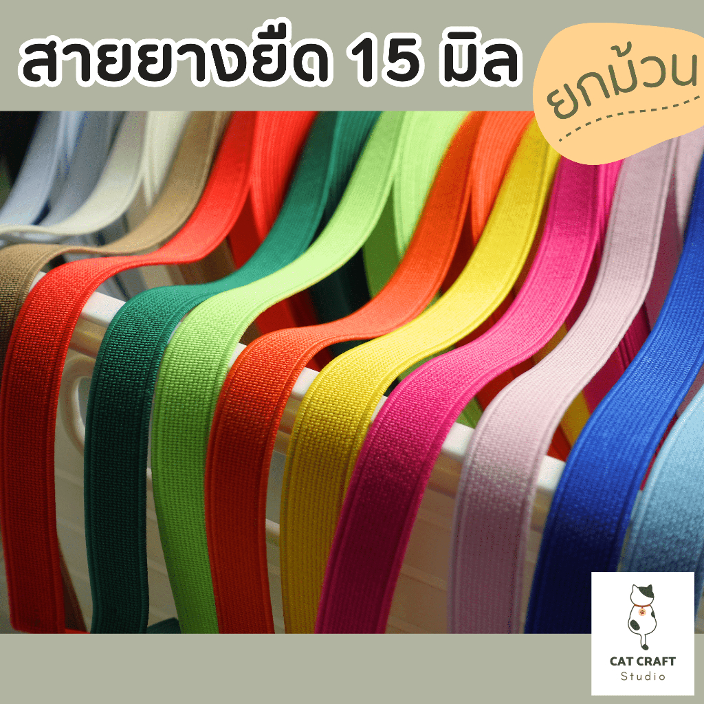 ยางยืด 15มิล สีสวย ใช้ทำปลอกคอนิรภัยแมวและงานผ้าอื่นๆ (ขายยกม้วน 16 เมตร)