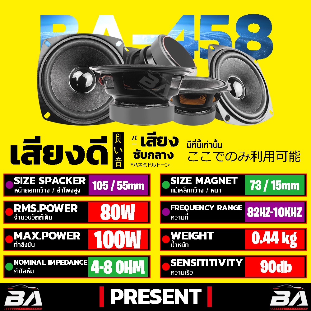 BA SOUND ลำโพง 4 นิ้ว 150วัตต์ BA-458 ลำโพงเสียงกลาง 4 นิ้ว อุปกรณ์ DIY สามารถใช้ในรถยนต์ได้หรือที่บ้านได้